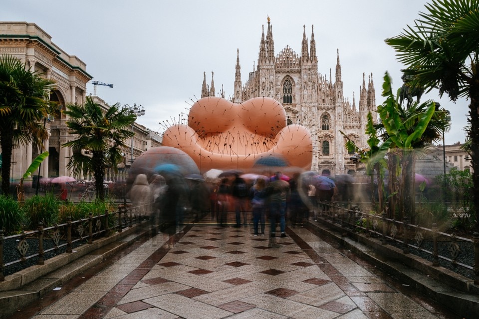 “Sono contento che la gente reagisca, a favore o contro”, aveva detto Gaetano Pesce domenica 7 aprile, alla vigilia dell’inaugurazione dell’installazione in piazza Duomo, realizzata in occasione dei 50 anni della sua iconica poltrona Up (versione 5 e 6). Una scultura monumentale – otto metri di altezza, in poliuretano espanso con rivestimenti in vetroresina rosa – concepita per denunciare la condizione di sudditanza di molte donne in tutto il mondo. Il tempo di tagliare il nastro, alla presenza dell’amministrazione cittadina che l’ha patrocinata, e sono arrivate le prime contestazioni di un gruppo di femministe che ha spruzzato l’opera di vernice rosso sangue contro l’idea della “donna come mobile”.