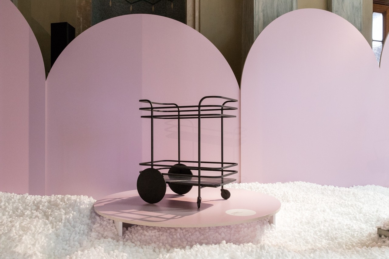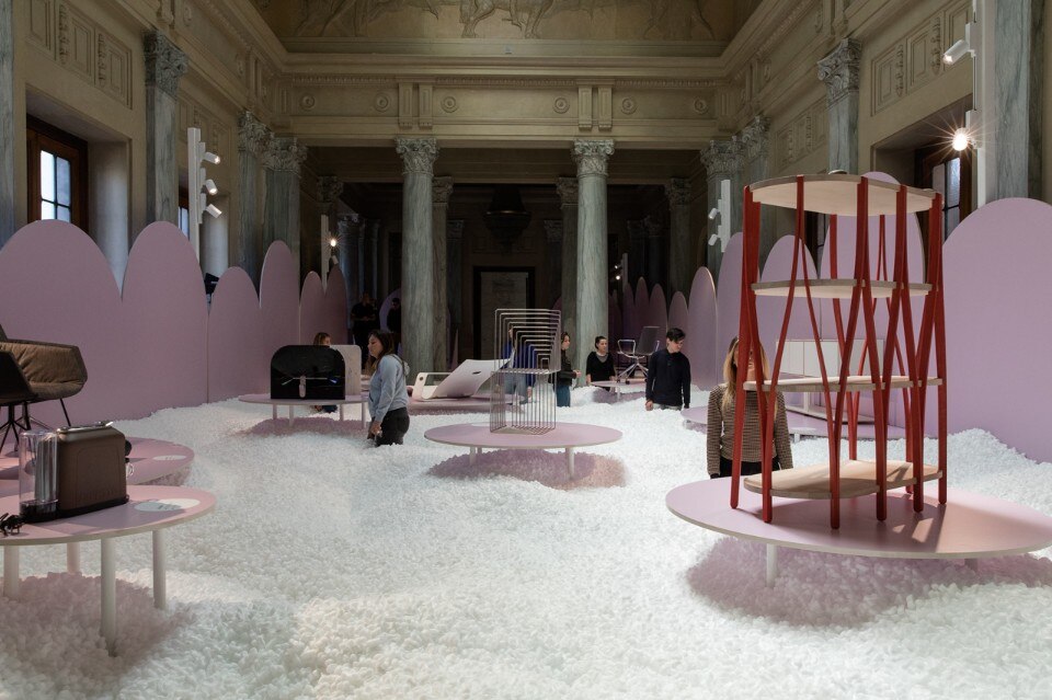 Collocata in una location suggestiva, l’antica sala d’attesa dei Savoia, la mostra immerge i visitatori in uno spazio scenografico e li conduce alla scoperta di scaffali, tavolini e sedute. L’allestimento, creato dagli architetti Michael Vasku e Andreas Klug include una “Designpool”, una vasca piena di palline di polistirene riciclato che creano un morbido manto bianco da attraversare per scoprire tutti i pezzi dell’esposizione. Oltre ai delicati toni pastello della “piscina”, c’è anche un’esposizione di accessori e servizi per la tavola collocati su piani neri che danno ritmo allo spazio.
