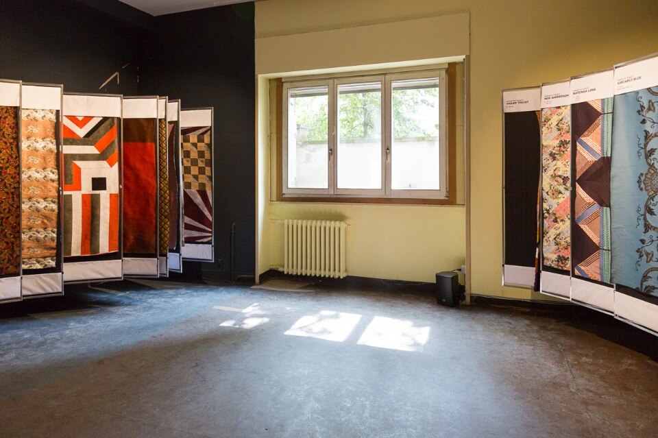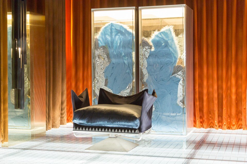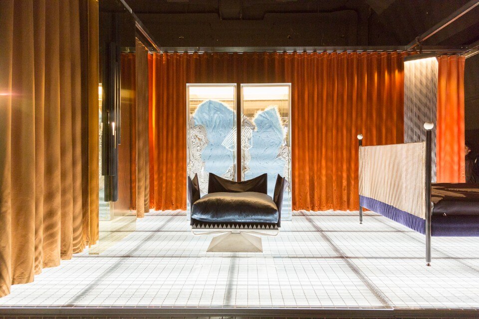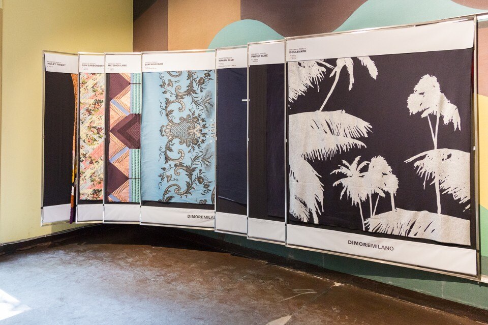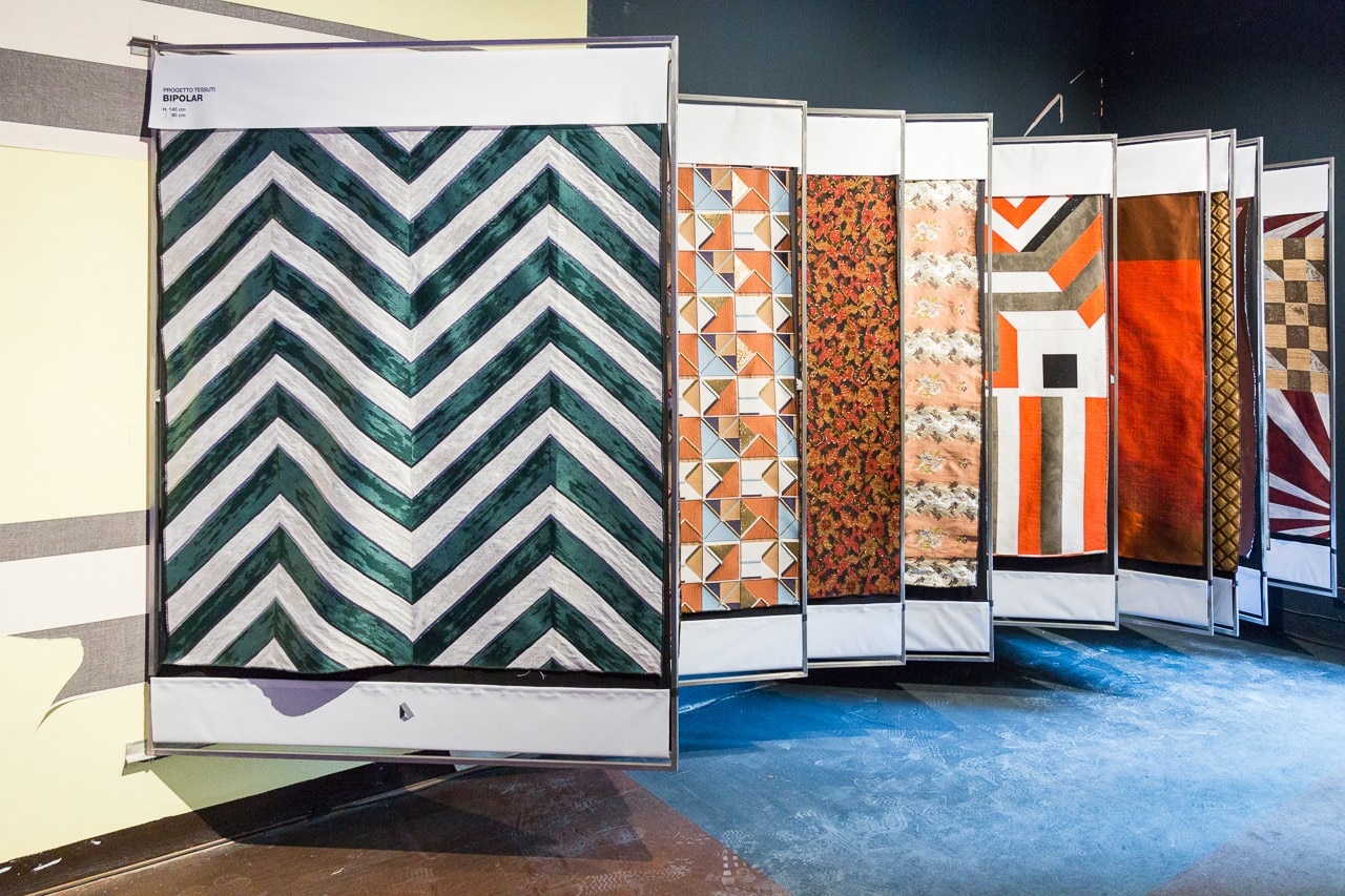 Sono entrambi in scena, su un pavimento fluttuante che ricorda un datacenter, nell’allestimento Interstellar, dove vanno a rivestire il primo le poltroncine in cemento e plexiglass, il secondo i cuscini della poltrona vis-a-vis 132. Nell’area dedicata al progetto tessuti l’atmosfera è opposta: alla crudezza techno di Interstellar si contrappone il progetto fotografico di Andrea Ferrari, allestito su uno spazio sfacciatamente non finito, come testimoniano le pareti, dove piastrelle spezzate lasciano intravedere picchettature della posa in opera. L’allestimento fotografico ci trasporta in uno slancio poetico di messa in scena dei tessuti in luoghi della città carichi di sentimento e verità, come i giardini di Porta Venezia e la Balera dell’ortica.