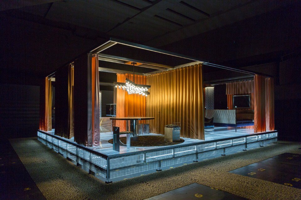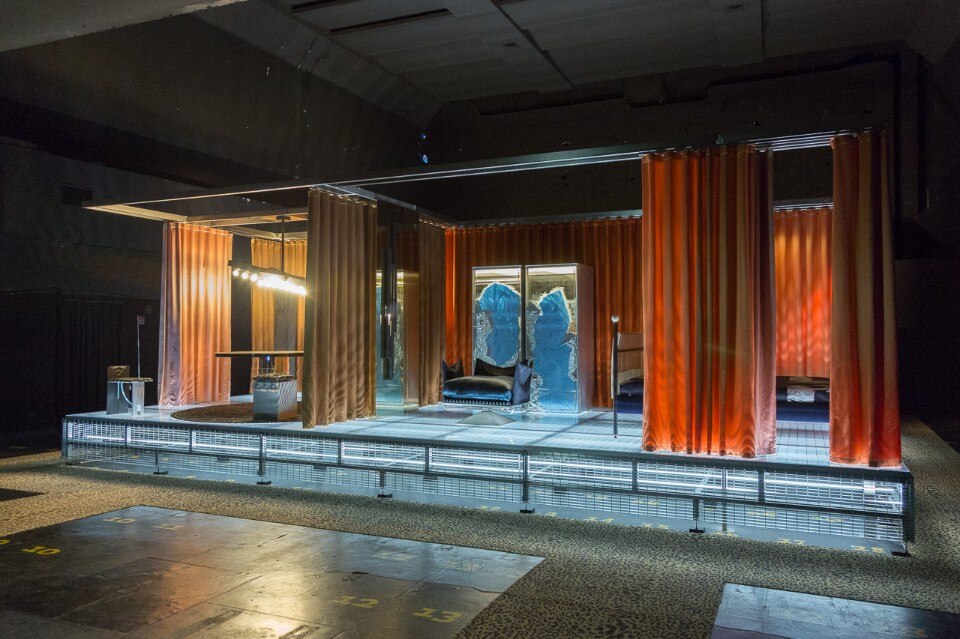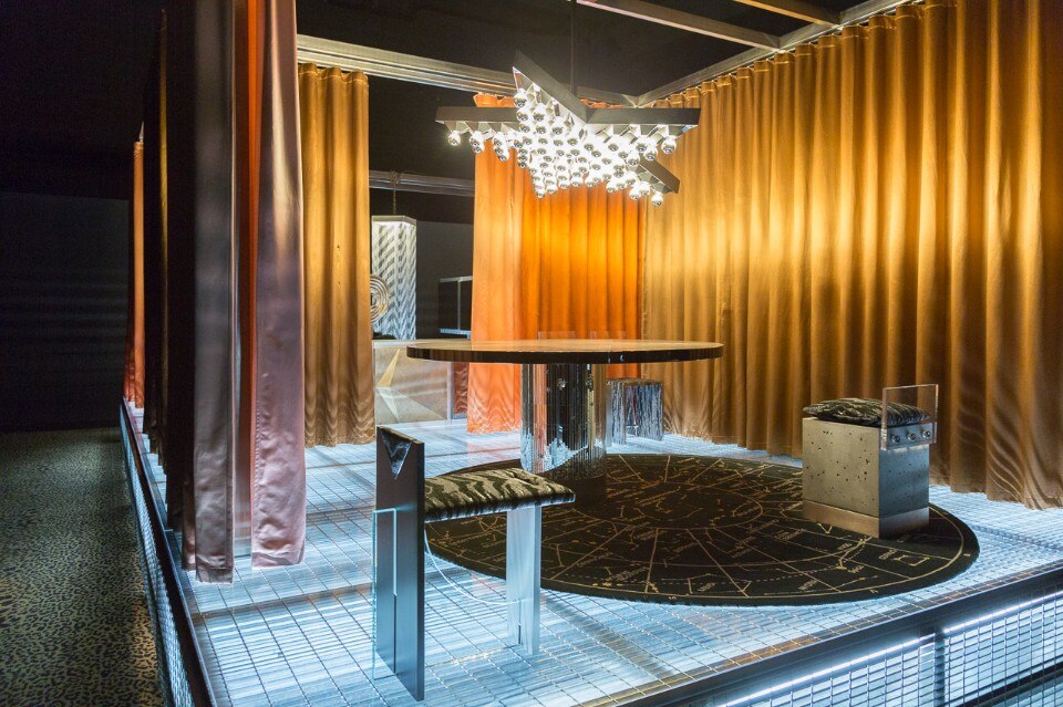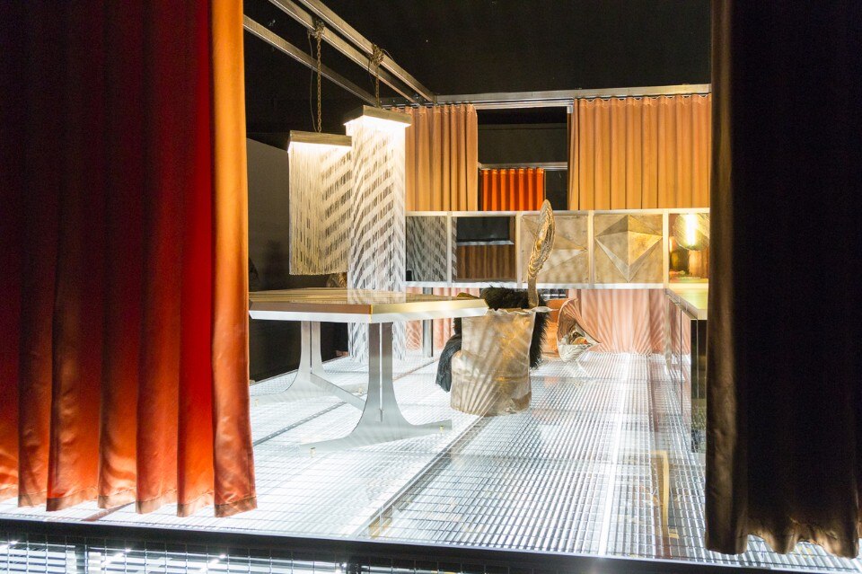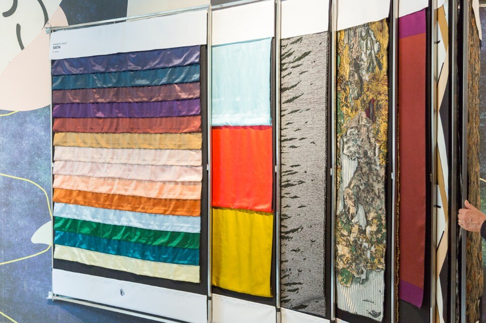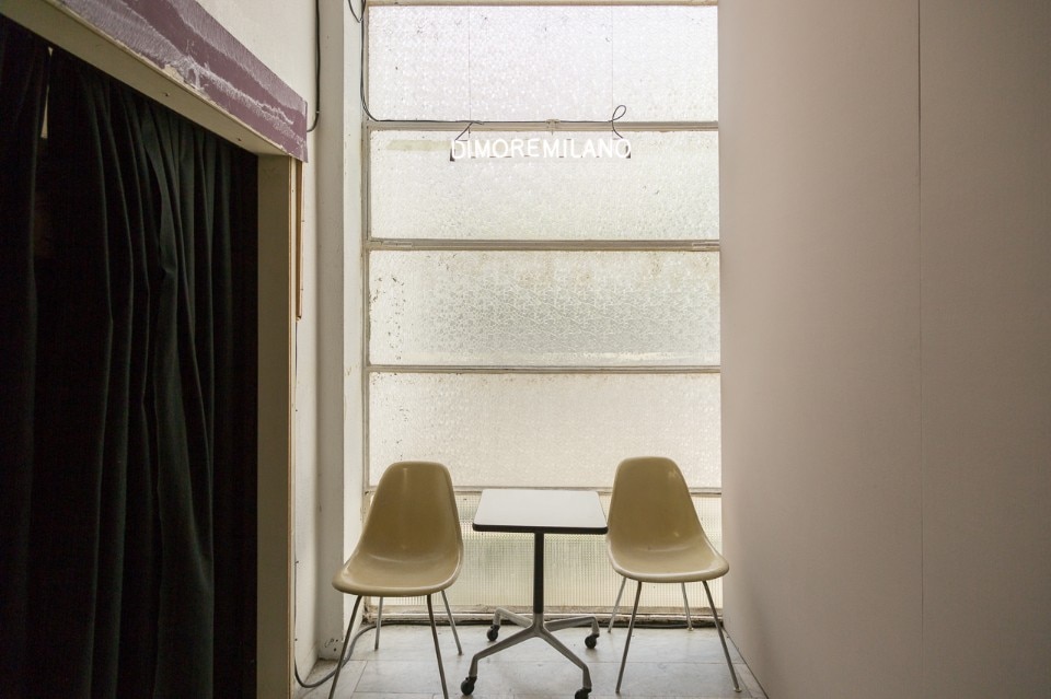 Sono entrambi in scena, su un pavimento fluttuante che ricorda un datacenter, nell’allestimento Interstellar, dove vanno a rivestire il primo le poltroncine in cemento e plexiglass, il secondo i cuscini della poltrona vis-a-vis 132. Nell’area dedicata al progetto tessuti l’atmosfera è opposta: alla crudezza techno di Interstellar si contrappone il progetto fotografico di Andrea Ferrari, allestito su uno spazio sfacciatamente non finito, come testimoniano le pareti, dove piastrelle spezzate lasciano intravedere picchettature della posa in opera. L’allestimento fotografico ci trasporta in uno slancio poetico di messa in scena dei tessuti in luoghi della città carichi di sentimento e verità, come i giardini di Porta Venezia e la Balera dell’ortica.