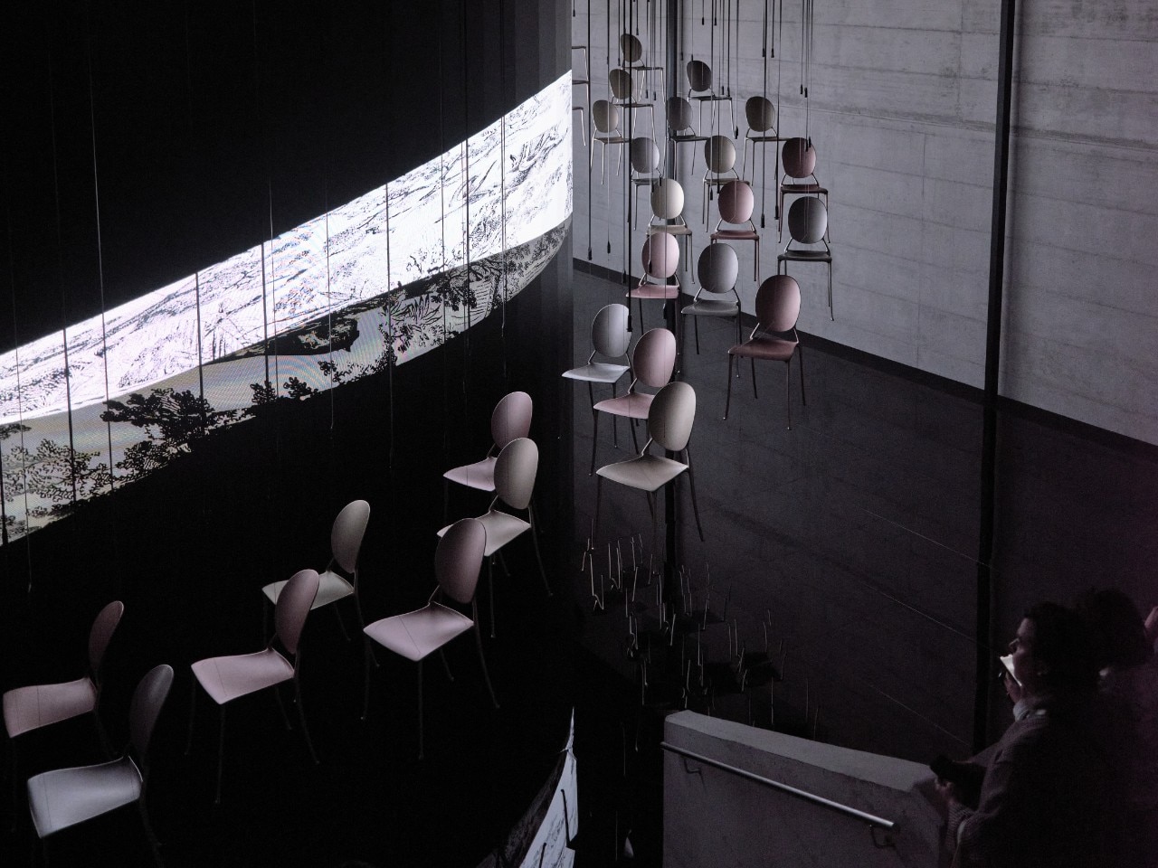 Nel piano interrato del palazzo, un monumentale schermo avvolge il celebre pilastro centrale, parte del progetto anni ’80 di James Stirling mai portato a termine. Come in una giostra che si tramuta in una elegantissima danza, in un movimento sincronizzato con il video che appare sul display, volteggiano nello spazio decine di sedie “Miss Dior” e “Monsieur Dior”, roteando mentre salgono e scendono. La doppia rampa di scale fa da spalto per i visitatori, insieme a un’apertura nella parete superiore che funge come una sorta di palchetto contemporaneo.