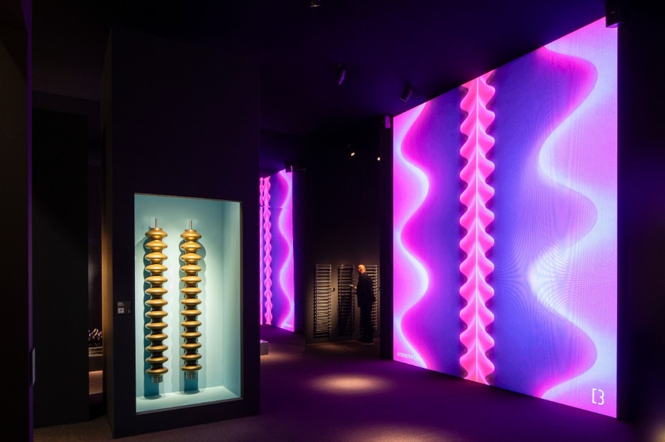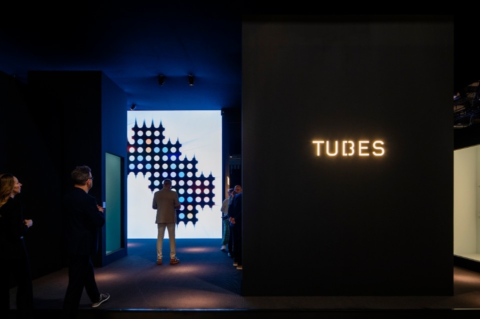 L’allestimento è animato da un’opera video creata da Alessandro Gomiero e generata tramite l’intelligenza artificiale (AI). Il video, riprodotto su un videowall di circa 16 metri quadrati, non è solo una interpretazione dei prodotti dell’azienda, ma è un’opera che fonde tecnologia e design, esplorando il mondo dei radiatori Tubes e le loro forme con una visione creativa ed un gioco di emulazioni.