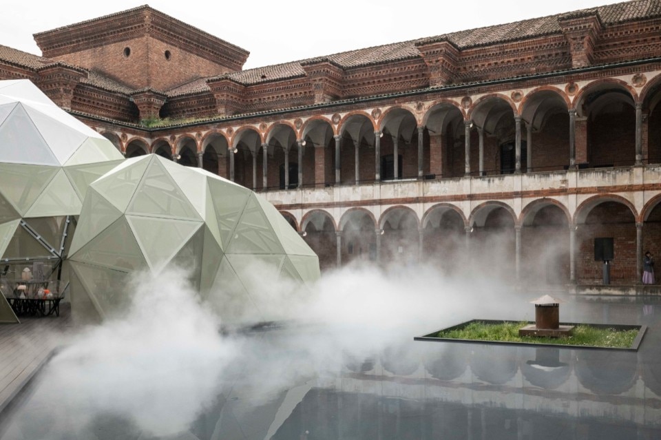 I cortili rinascimentali del Filarete, prima ospedale degli Sforza oggi università, invasi da uno sciame di installazioni sono l’immagine di una delle componenti più popolari del Fuorisalone: anche quest’anno tornano, con CrossVisions Interni 70 – e la concomitanza dell’apertura con le giornate di laurea ha aggiunto al tutto una certa nota performativa che anche alcuni partecipanti hanno sposato. Su questo fondale si sviluppano installazioni come lo specchio d’acqua nebbioso di Mad Architects per Amazon al Cortile della Farmacia, Piero Lissoni per Sanlorenzo, il totem di Patricia Urquiola per Cimento, le pietre di Kengo Kuma per Quarella e, in Aula Magna, il modello di Mario Cucinella per il padiglione italiano ad Expo 2025 Osaka.