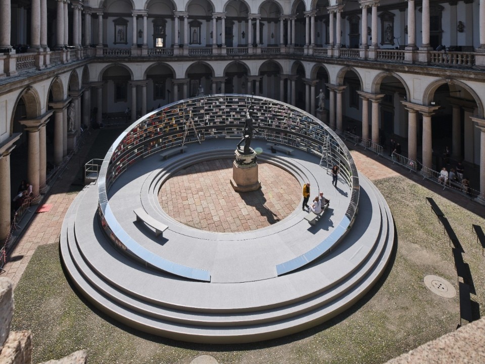 All’opposto, ma sempre di alto impatto, c’è Es Devlin a Brera, con la sua Library of Light. Qui la fila è garantita, ma lo è anche l’esperienza: un’installazione luminosa che trasforma il chiostro dell’Accademia in una macchina del tempo emotiva.