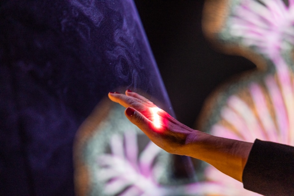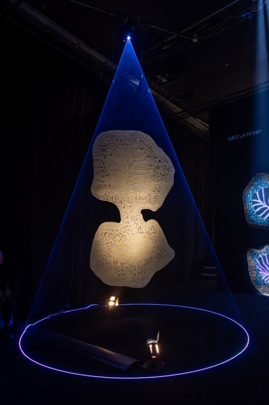 È sfuggita dall’itinerario di molti — probabilmente anche per via dei lavori in corso su Via Correnti che coprono l’ingresso — una tappa che noi invece reputiamo quasi irrinunciabile. Nello spazio del Teatro Arsenale, edificio che è in piedi dall’epoca medievale, Estúdio Campana presenta Floralis, la nuova collezione di tappeti disegnata per Art de Vivre. Si varca la soglia schermata dal velluto nero e ci si trova di fronte a una grande forma irregolare percorsa al suo interno da una ramificazione coloratissima di segmenti che ricorda un organismo cellulare. In effetti, il riferimento all’immaginario biologico si rintraccia in moltissimi degli ultimi lavori dello studio, oggi guidato da Humberto Campana, che in questa occasione ha raccontato a Domus: “È urgente guardare alla natura come forma di guarigione e interagire con essa in armonia con il bene comune della società. È qualcosa che la natura stessa ci chiede da tempo e che necessita di un modo di vedere le cose più intimo e più profondo.” Intimo e profondo è anche il rapporto che si stabilisce tra i tappeti e chi li osserva: l’ambiente scurissimo concede un raggio di luce solo alle opere che sembrano fluttuare nel vuoto all’interno di capsule disegnate dalla luce stessa.