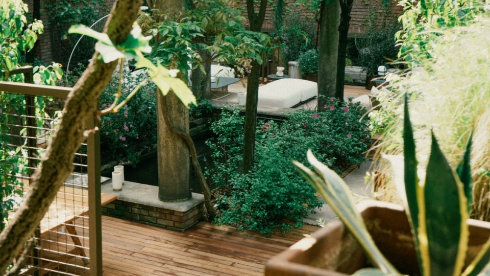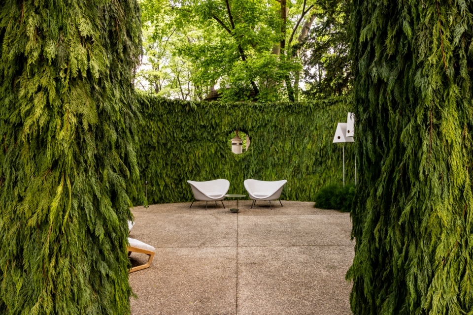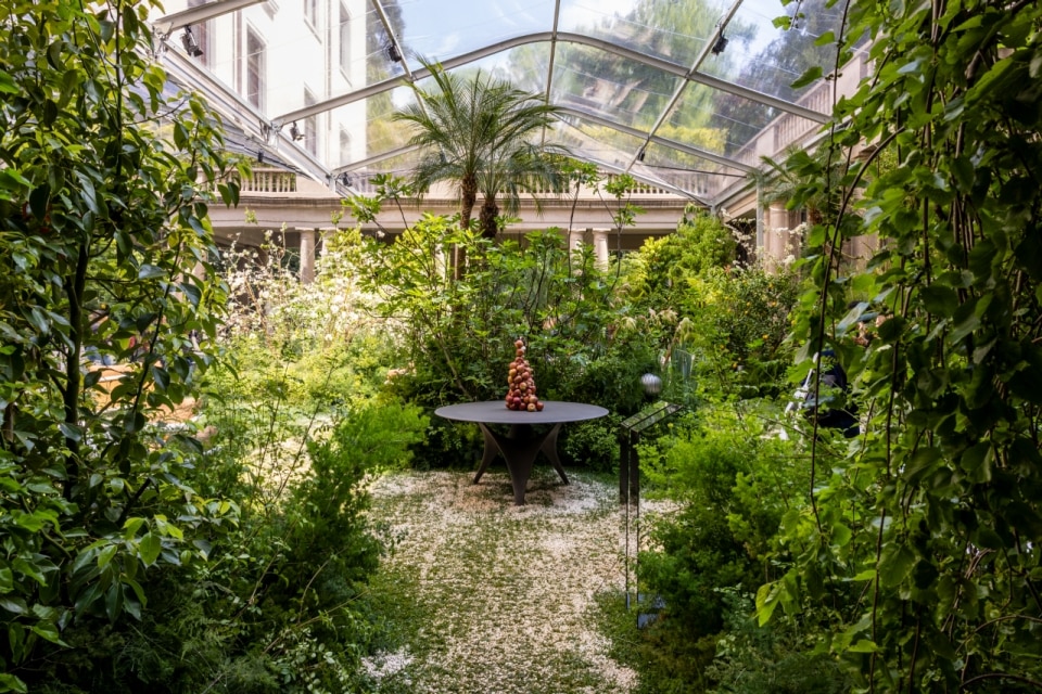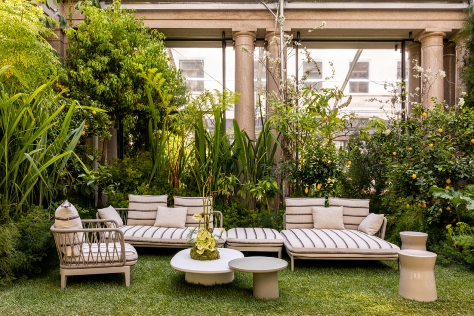 La situazione è quella in assoluto più Milano Design Week, una combinazione di racconto allestitivo e scoperta di luoghi simbolici della città: il giardino dove Molteni&C presenta la sua collezione outdoor sembra estendersi all’infinito dentro il cuore dell’isolato su via Senato, e il progetto di Elisa Ossino Studio lo trasforma in un ecosistema di sei mondi botanici. Si parte dalla corte colonnata del palazzo, un Giardino dell’Eden abitato dagli arredi outdoor delle collezioni Soleva di Vincent Van Duysen, Chelsea Outdoor di Dordoni Studio, e dal tavolo Arc di Foster + Partners, per poi esplorare un terzo paesaggio à la Gilles Clément, un giardino acquatico, e un altro calcolato e produttivo – un hortus botanicus tutto frutti e profumi – fino a un giardino lunare dove anche le interpretazioni outdoor di pezzi di Gio Ponti si incontrano in uno spazio metafisico di fronde solide, senza aperture se non sul cielo, sulle chiome degli alberi secolari e – attraverso un piccolo oculo vegetale – sulla statua di una piccola glorietta neoclassica appena dietro. Una foresta generata da algoritmi frattali è poi l’ultimo ambiente, stavolta digitale, che riporta i visitatori verso la città.