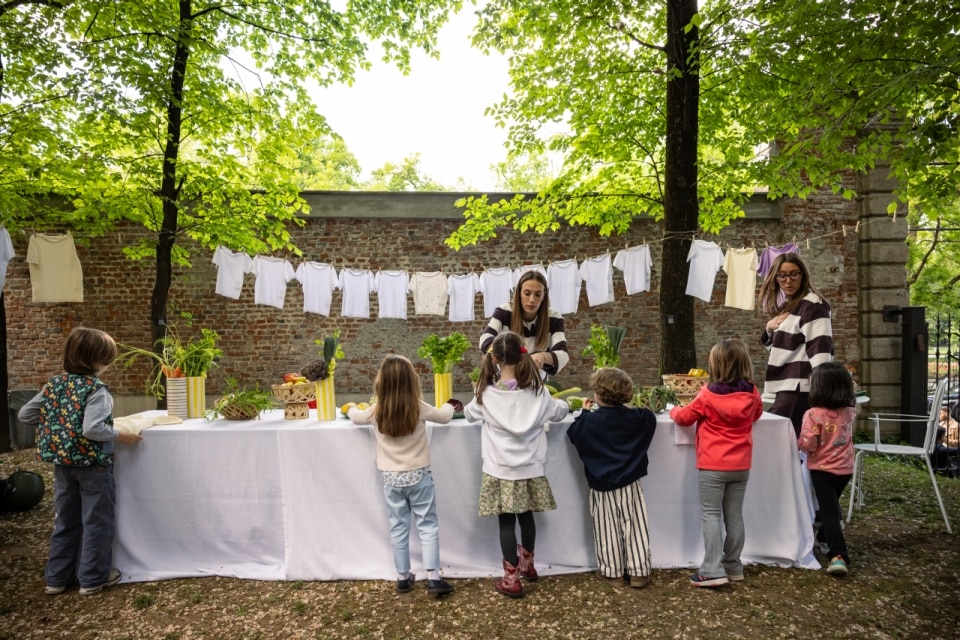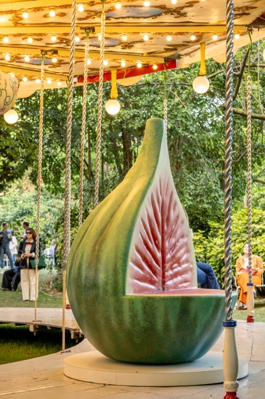 Il tema del riposo si declina anche in forme più intime e raccolte, come nell’installazione Floralis di Estúdio Campana al Teatro Arsenale, dove tappeti e luce costruiscono uno spazio quasi meditativo tra natura e astrazione. E poi la giostra di Laila Gohar per Arket, installata tra i giardini di Palestro e Porta Venezia: un intervento minimo ma straniante, dove frutta e verdura fuori scala trasformano un dispositivo ludico in un momento di sospensione collettiva. Altrove, come nella fabbrica dismessa di via Padova occupata da Deoron, il riposo assume forme più ambigue, tra listening sessions notturne e monumentali sound system.