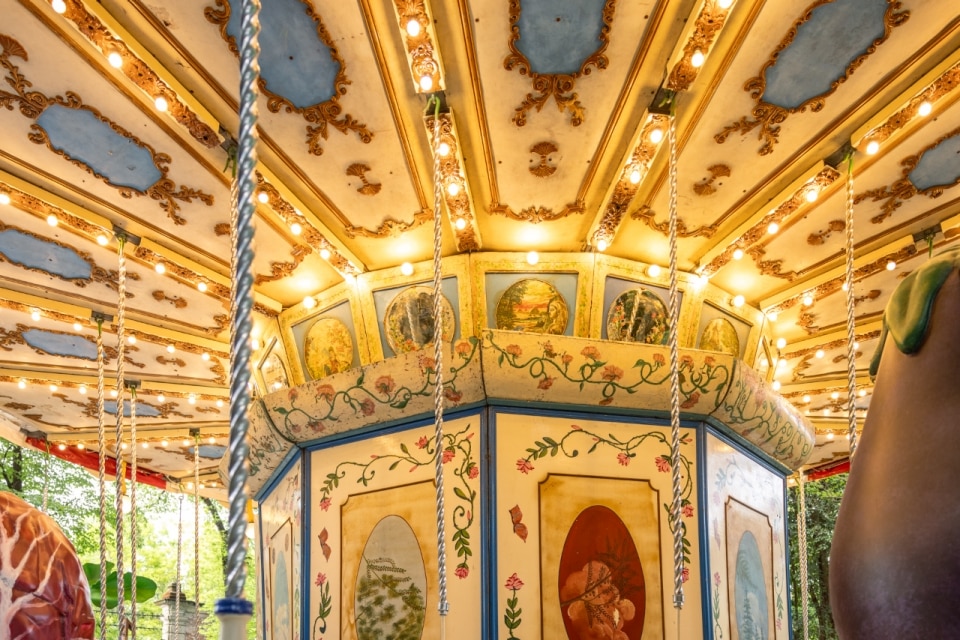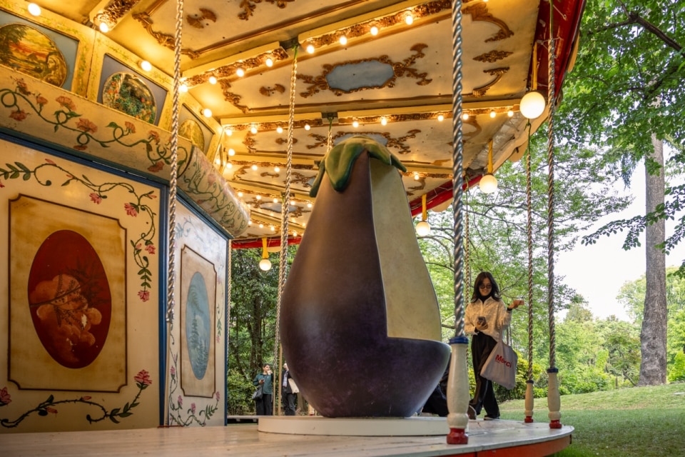 Via Palestro è quella che separa i Giardini di Porta Venezia, forse i più belli di Milano, da quelli che ne portano il nome. Nella stessa via ci sono anche musei come la Gam, il Pac, la sede milanese di Cipriani e un bar speciale come il LùBar. È in questa via piena di arte e di storia – tra cui un terribile attentato estivo – che Arket posiziona la sua giostra. Non è una giostra qualsiasi: è un esemplare antico, tra i pochi sopravvissuti di una tradizione artigianale europea, qui reinterpretato insieme all’artista newyorkese Laila Gohar. Al posto dei cavalli, frutta e verdura sovradimensionate diventano sedute e sculture, trasformando l’oggetto in una scenografia interattiva tra design e teatro. L’intervento è minimo ma efficace: un taglio netto e forme quotidiane diventano elementi di gioco condiviso. L’installazione accompagna una collaborazione tra Arket e Gohar che si traduce in una collezione di 27 capi: un passaggio diretto dall’immaginario dell’artista allo spazio del vestire, senza cambiare scala ma solo contesto.