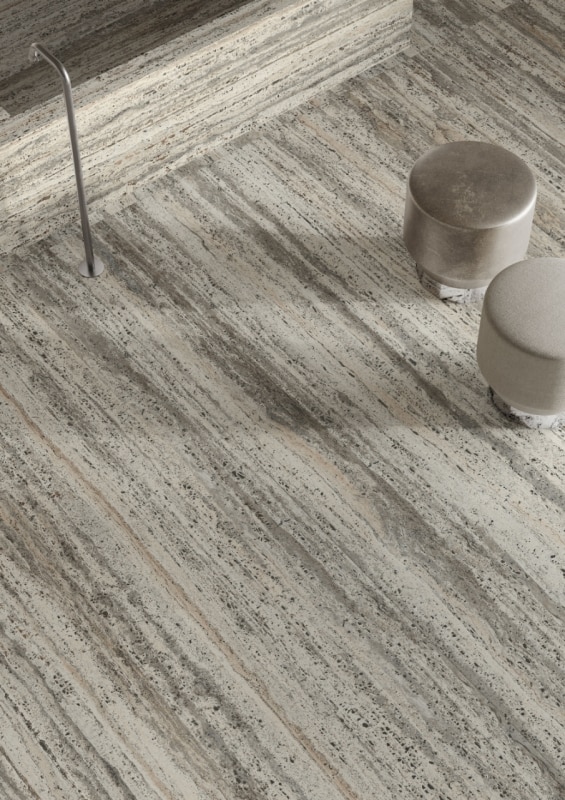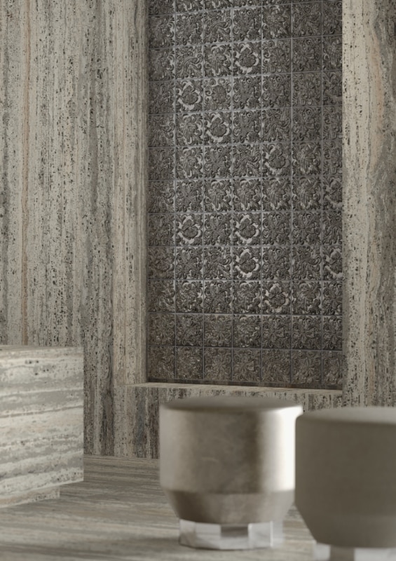 Travessa rilegge il travertino in chiave contemporanea, mantenendone tutto il carattere nelle profondità chiaroscurali delle venature e nella matericità calda, mentre la trama degli elementi consente di creare grandi superfici con un effetto di massima continuità. Breccia Rosa 4D esprime invece una forza cromatica intensa, dove le tonalità rosate e le venature irregolari dialogano con una ricchezza di dettaglio resa possibile dalla tecnologia 4D di Iris Ceramica Group, che estende il disegno nel corpo della lastra oltre la superficie e fino ai bordi.