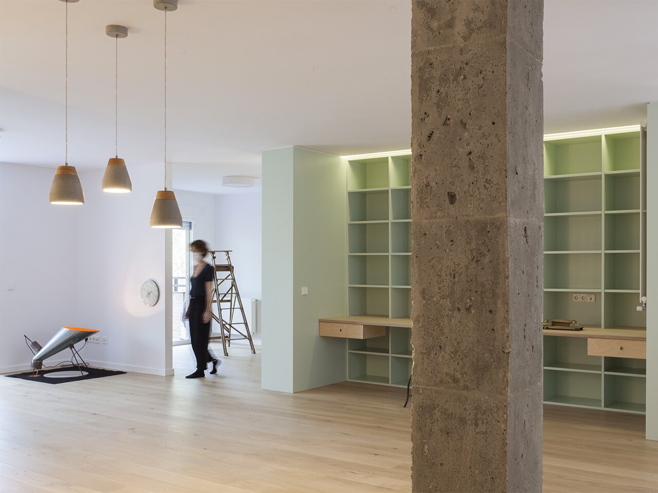 Con la nuova distribuzione, il soggiorno-sala da pranzo e la cucina sono ora separati dalla zona privata da un grande mobile che riceve luce da entrambe le facciate attraverso le porte delle camere da letto. L’elemento, che caratterizza il progetto dal punto di vista estetico e formale, è il grande box centrale che, strategicamente, è stato posizionato nella zona più buia della casa. Questo mobile svolge una doppia funzione: da un lato organizza la circolazione tra gli spazi comuni e quelli privati, dall’altro risolve i problemi di stoccaggio: su un lato funziona come zona spogliatoio e su quello che si affaccia sul soggiorno-sala da pranzo, come una biblioteca e uno studio. Il colore verde è stata una proposta dello studio che i proprietari hanno amato perché ricorda loro gli anni dell’infanzia, mentre il pavimento è in legno di quercia naturale.