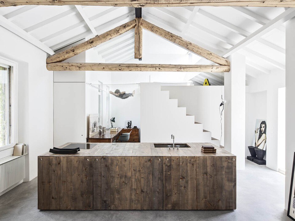La combinazione delle imponenti capriate con il pavimento in cemento – lo stesso utilizzato nell’antistante terrazza, questa sì vissuta in estate come spazio per ricevere - richiamano un registro di stampo industriale, che trova però nell’integrazione di assi di recupero opportunamente scenografate una nota di accurata sofisticazione. Addossata alla parete dell’ingresso, una vasta libreria su disegno trasforma la presenza di numerosi volumi in una quinta decorativa, mentre grandi oggetti protagonisti del design industriale prevalentemente italiano – tra cui Le Bambole, Parentesi, Putrella o ancora lo sgabello Kono sempre di Mario Bellini – puntellano la scena di icone dal volto familiare.