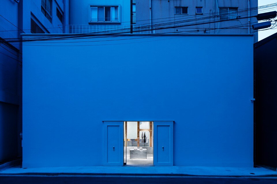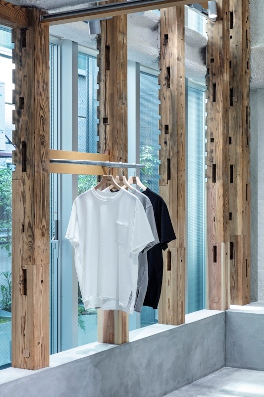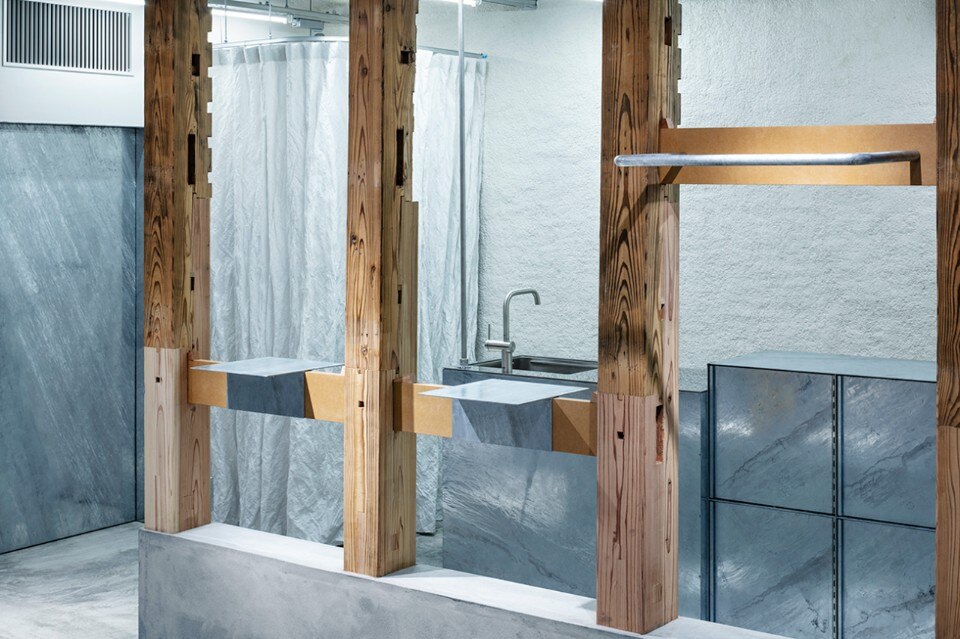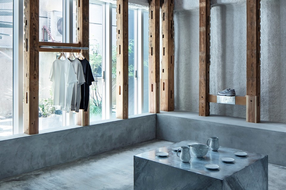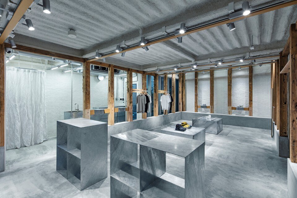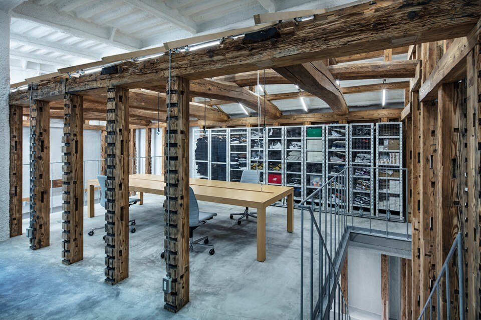 Contrappunti materici, tattili e cromatici creano una suggestiva ambientazione all’interno del mondo di New Balance. Il legno massello scalfito dalla patina del tempo viene combinato con la resina liscia grigia della pavimentazione e la finitura bianca grezza delle pareti del capannone. Elementi di MDF incastrati nei fori dei pilastri di legno fungono invece da dispositivi di supporto per faretti, appenderie e piedistalli su cui viene allestita una selezione raffinata di calzature, tè giapponese e pezzi di ceramica di manifattura locale.