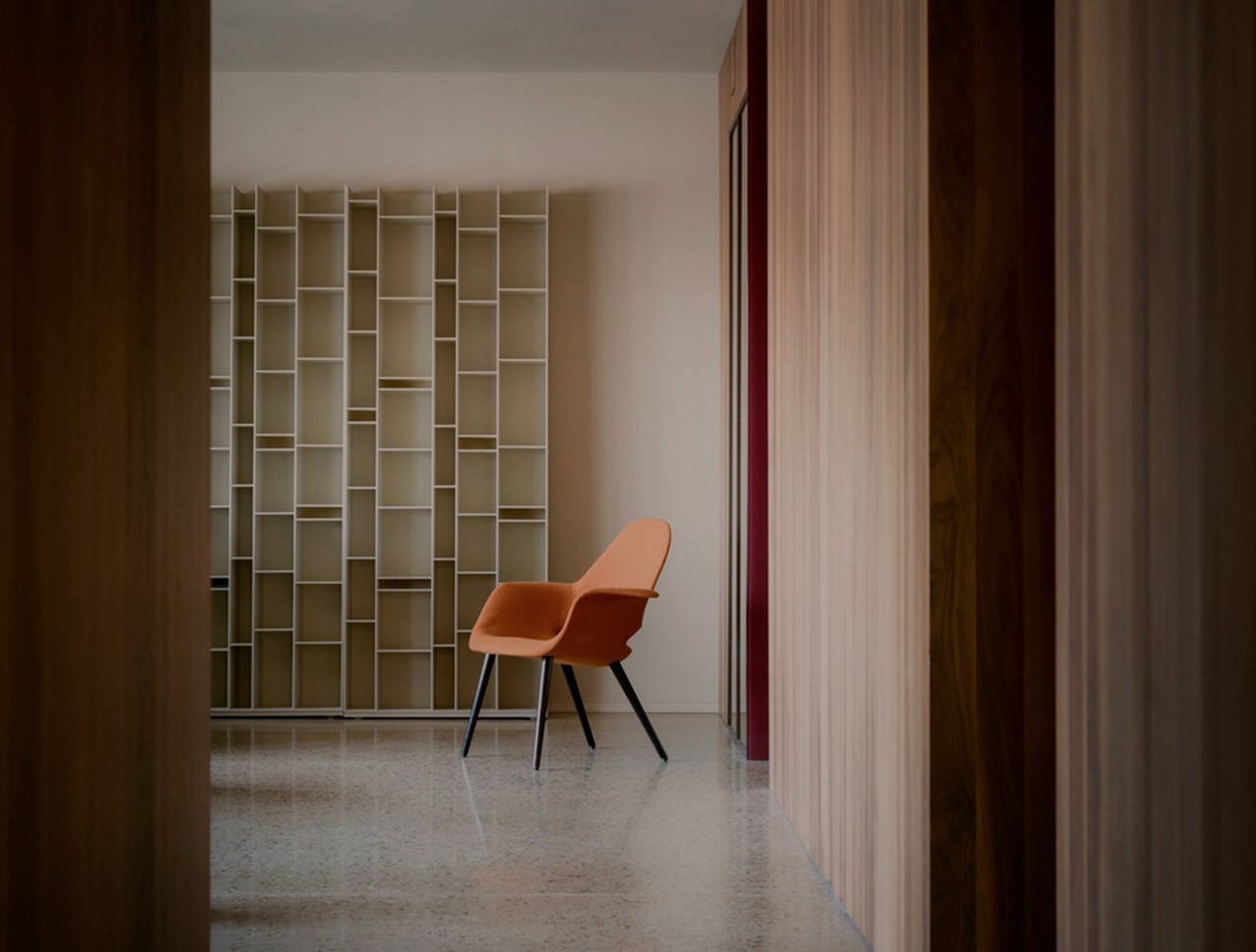 L’evidente rimando all’abitazione tradizionale borghese milanese e ai suoi maestri si coglie invece nella scelta raffinata dei materiali di finitura e nel disegno accurato dei complementi d’arredo.