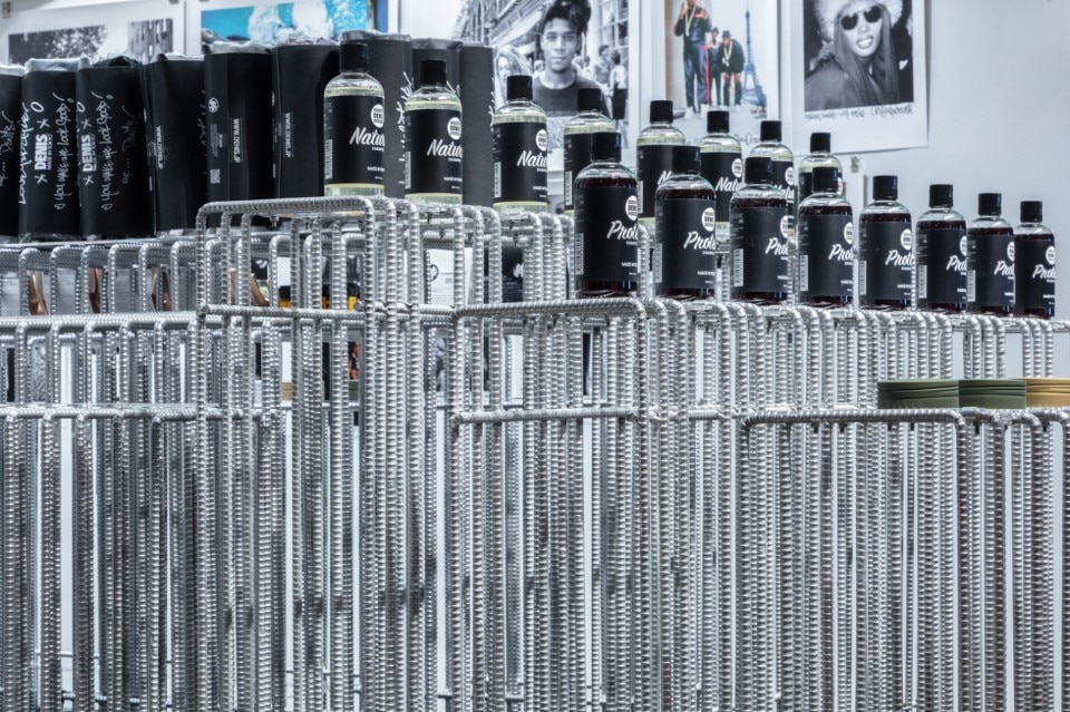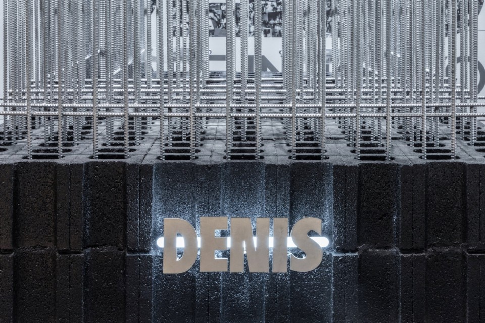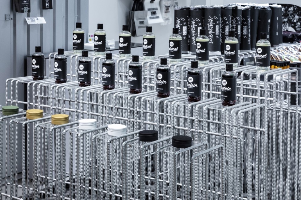Ecco che blocchi di cemento e barre di rinforzo di acciaio vanno a costruire un dispositivo per l’esposizione dei prodotti, attorno a cui il visitatore può muoversi liberamente come in uno spazio pubblico. Rialzato rispetto alla galleria commerciale, nella parte posteriore del negozio, tra specchi e fotografie di tribù urbane viene invece collocato il salone dove potersi tagliere i capelli.