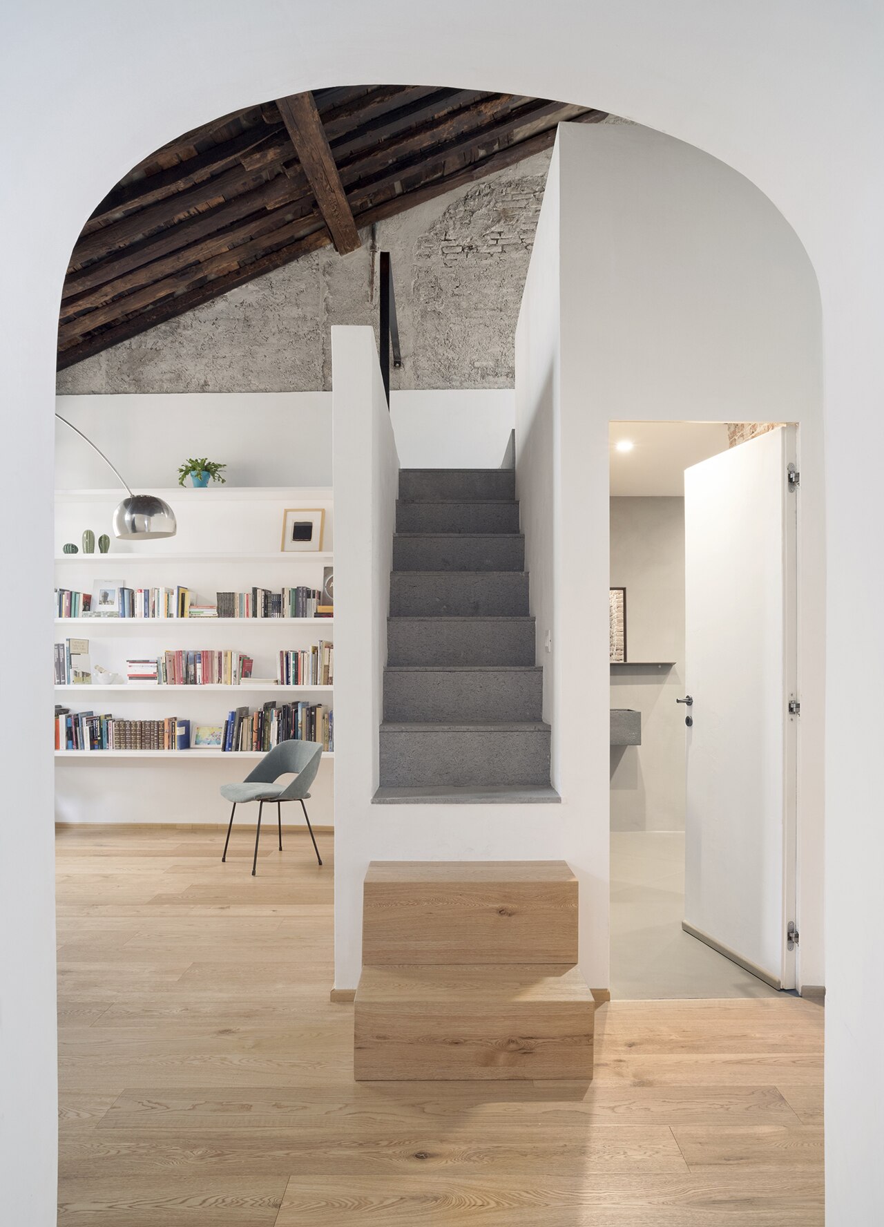 Per i due progetti l’intrico dei loro ambienti multiformi e su più livelli non è un ostacolo da rimuovere, ma una fonte di occasioni spaziali. Le scale di nuova realizzazione – di ardesia nera e visivamente racchiuse quelle della Casa per un lupo di mare, di scatolare metallico e rovere quella aerea della Casa ai bailucchi – sono connessioni ma anche soglie percepibili tra stanze e atmosfere diverse, come il letto soppalcato di Dodi Moss e lo studiolo con vista di llabb. I due soggiorni aperti sulle terrazze sono, naturalmente, il luogo cardine della vita domestica, il vero lusso che compensa i disagi di soluzioni abitative lontane dai canoni di ottimizzazione del mercato delle nuove costruzioni.