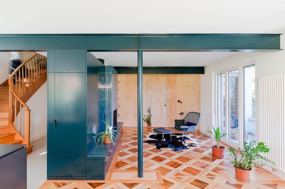 Sulla base degli input ricevuti dai proprietari, lo studio di architettura Bureau Brisson ripensa una piccola villa su tre livelli attraverso un intervento focalizzato sul pian terreno. Grazie all’inserimento di due putrelle, lo spazio viene aperto imponendo un flusso di passaggio circolare che ruota intorno alla nuova collocazione del camino. Ampliato, lo spazio del salotto è comunicante con la zona pranzo, a sua volta vicina alla cucina.