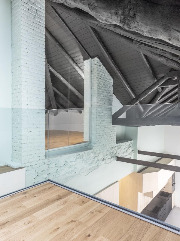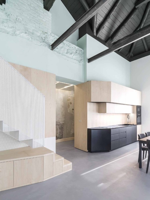 Accanto ai nuovi rivestimenti e arredi, alcuni elementi preesistenti vengono valorizzati in chiave contemporanea. In particolare, le travi originali in legno, restaurate e ridipinte con una intensa tinta scura, mettono in risalto la manualità che le ha forgiate e donano profondità all’ambiente, trasformandosi insieme alle porzioni di muro in mattoni a vista in uno strumento tangibile per racconta la storia dell’edificio e la sua evoluzione nel corso del tempo.