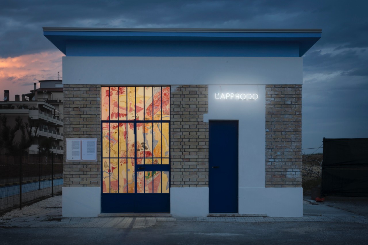 Negli anni Ottanta era una rimessa per pescatori, situata a pochi metri dall’attuale Marina di Porto San Giorgio, un paesino marchigiano sul mare, vicino a Fermo. L’Approdo è uno stabile piccolo che si distingue per gli infissi anni Cinquanta e l’insegna verniciata di blu. I locali lo hanno chiamato a lungo “sgabbiotto”, finché non è diventato un punto di rivendita di cozze, chiuso dopo qualche anno e lasciato in stato di abbandono. Oggi, grazie a un progetto di riqualificazione e promozione territoriale unico nelle Marche, L’Approdo è un polo culturale dedicato all’arte contemporanea, visibile dall’esterno 24 ore su 24.