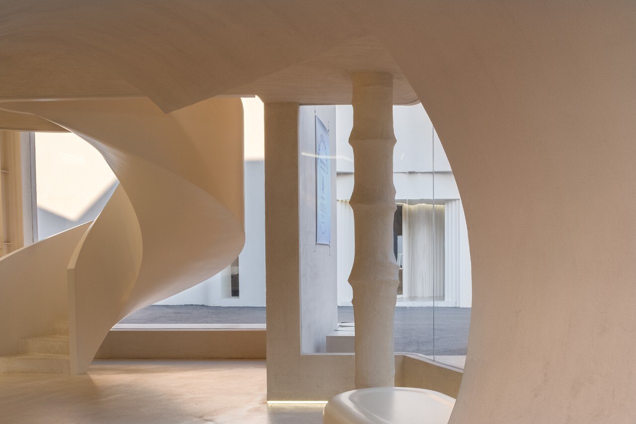 Mentre le facciate esterne sono definite da tagli plastici e scultorei, negli spazi interni i progettisti, guidati dalle logiche di “digestione, rimodellamento e coesistenza”, hanno condotto un’operazione di ristrutturazione attenta e non invasiva, dove il bianco dei nuovi edifici si fonde con dettagli grezzi dell’acciaieria “in cui ristagna il tempo”.