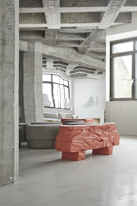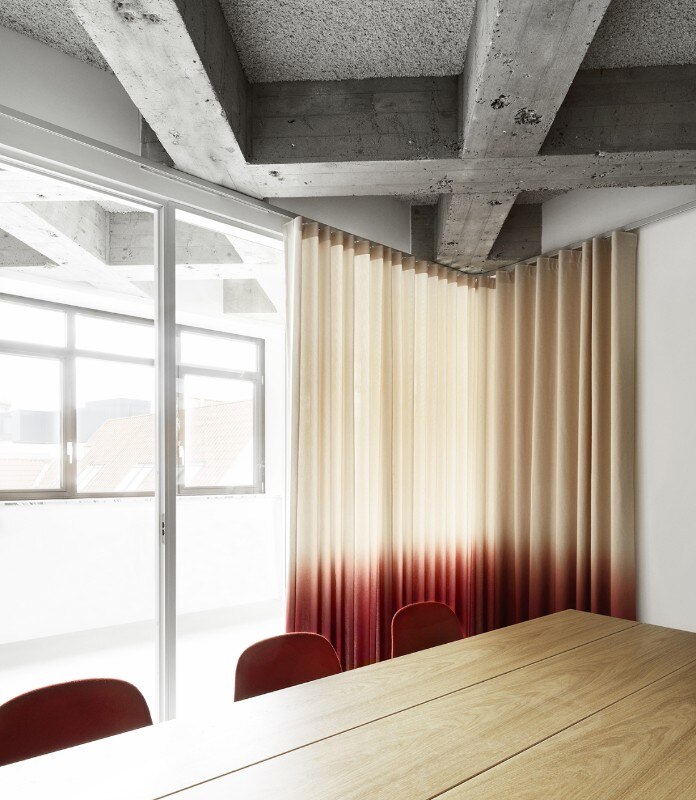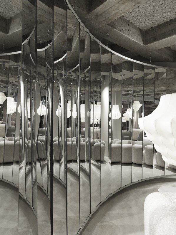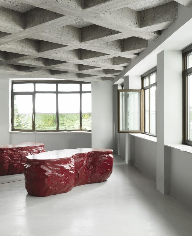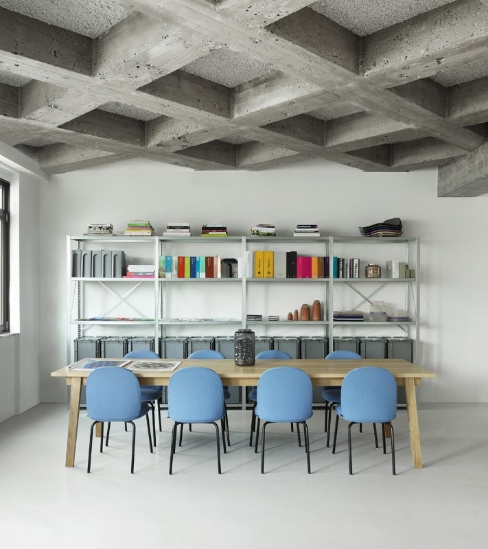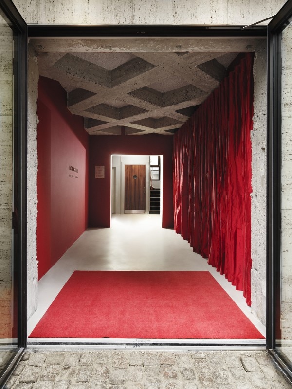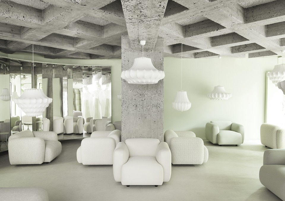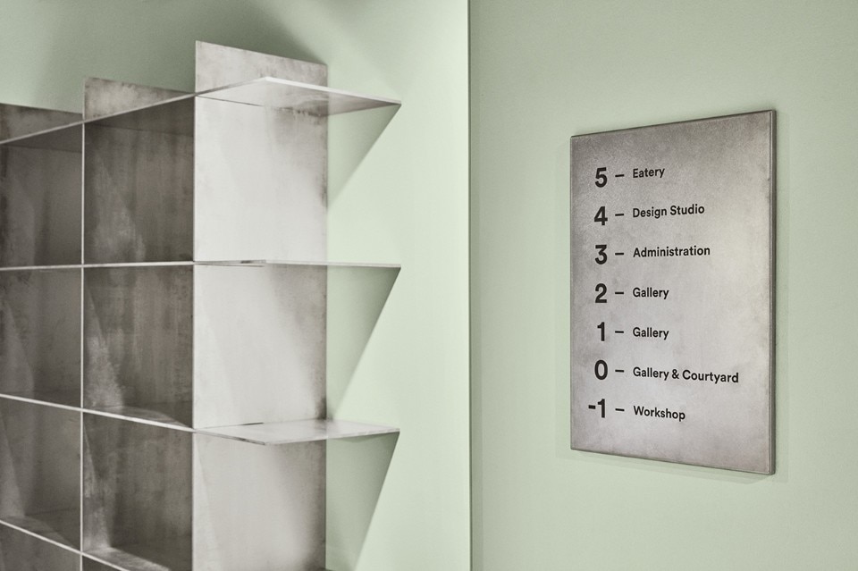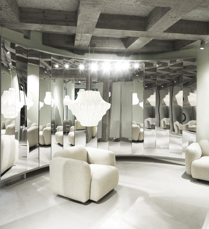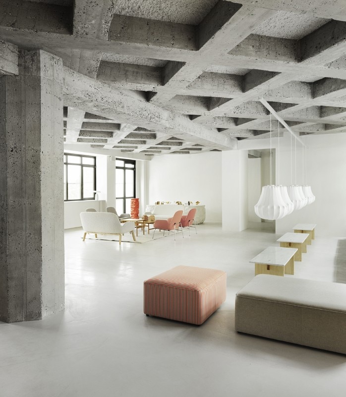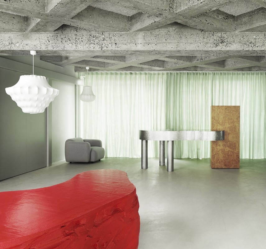Il progetto si sviluppa su sette livelli, ciascuno dei quali è caratterizzato da un tema cromatico. Un piano dopo l’altro al grigio del cemento troviamo abbinati pareti colorate di verde menta e color carne, elementi rosso rubino o rosso papavero, arredi azzurri o giallo canarino… Il risultato è un linguaggio che unisce l’architettura, classica ma grezza e le collezioni del brand, caratterizzate da un design senza tempo e che affiancano ai pezzi noti dell’azienda tutta una serie di nuovi prodotti.