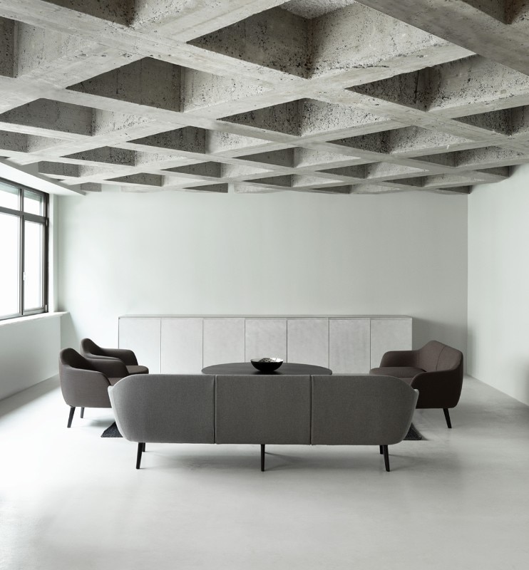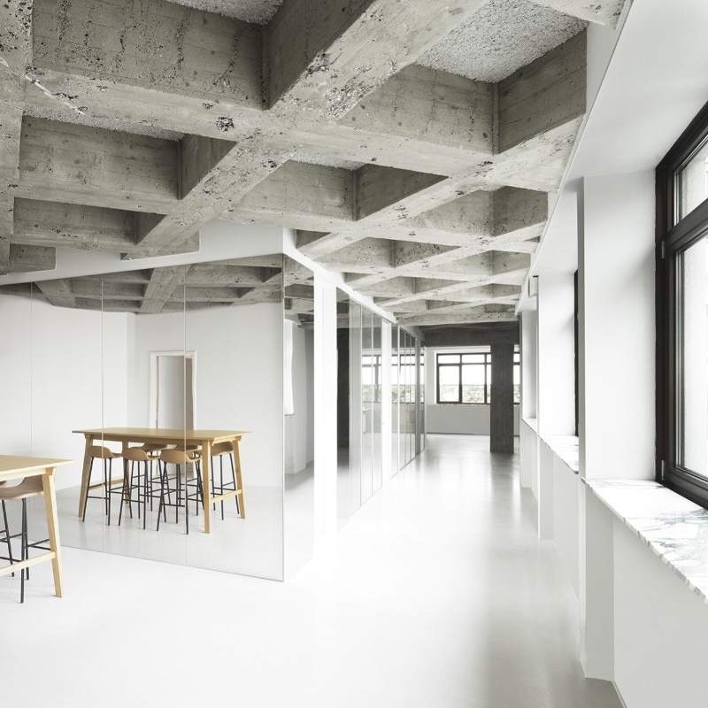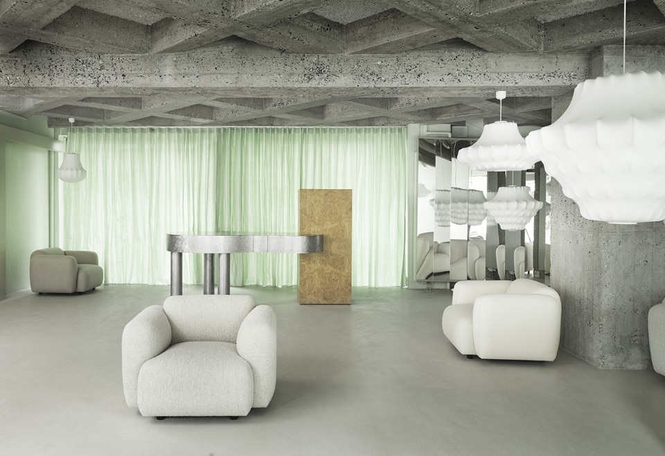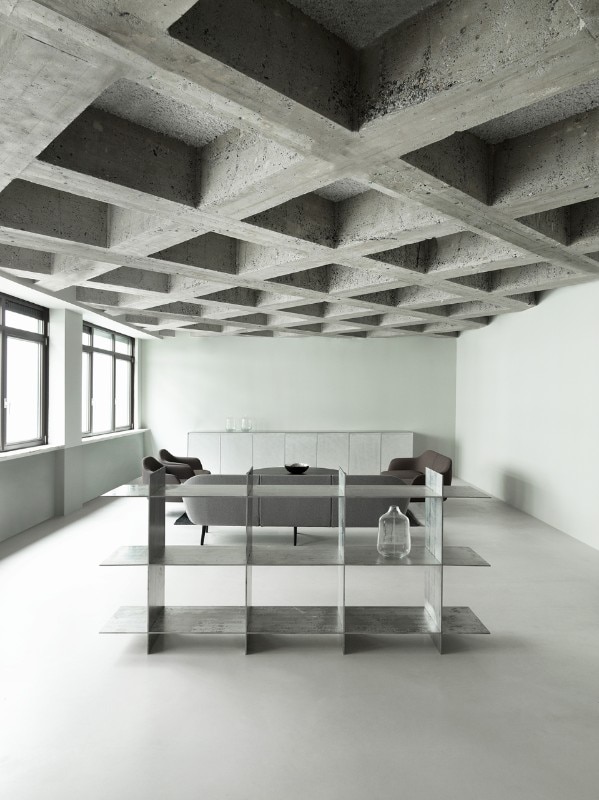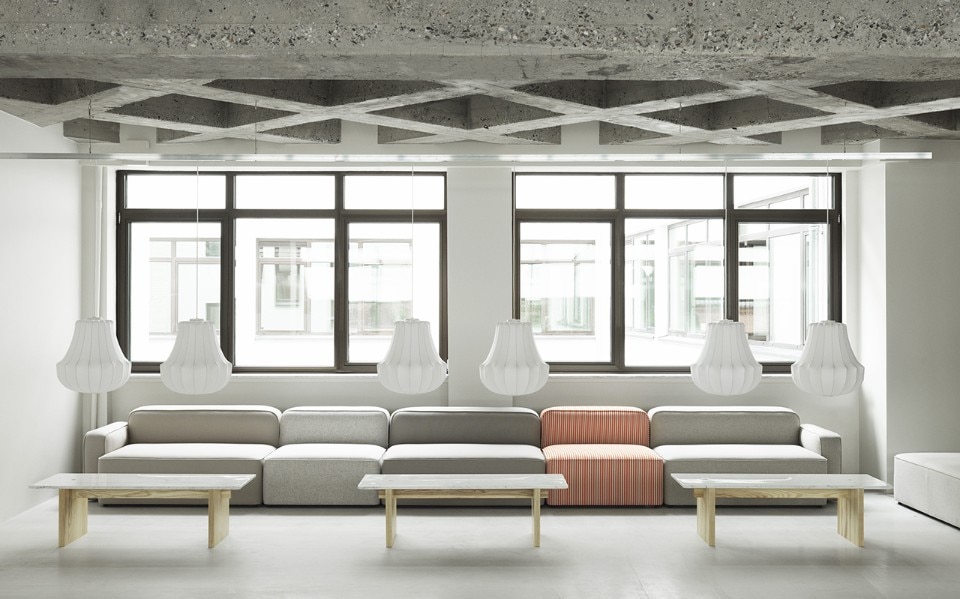 Il nuovo corporate space si trova all’interno di un edificio industriale costruito nel 1936 e precedentemente adibito a stamperia. L’intervento a opera del reparto di design interno all’azienda mantiene intatto il carattere originale della struttura e in particolare un suo elemento architettonico dal grande impatto scenico: i soffitti cassettonati di cemento grezzo.