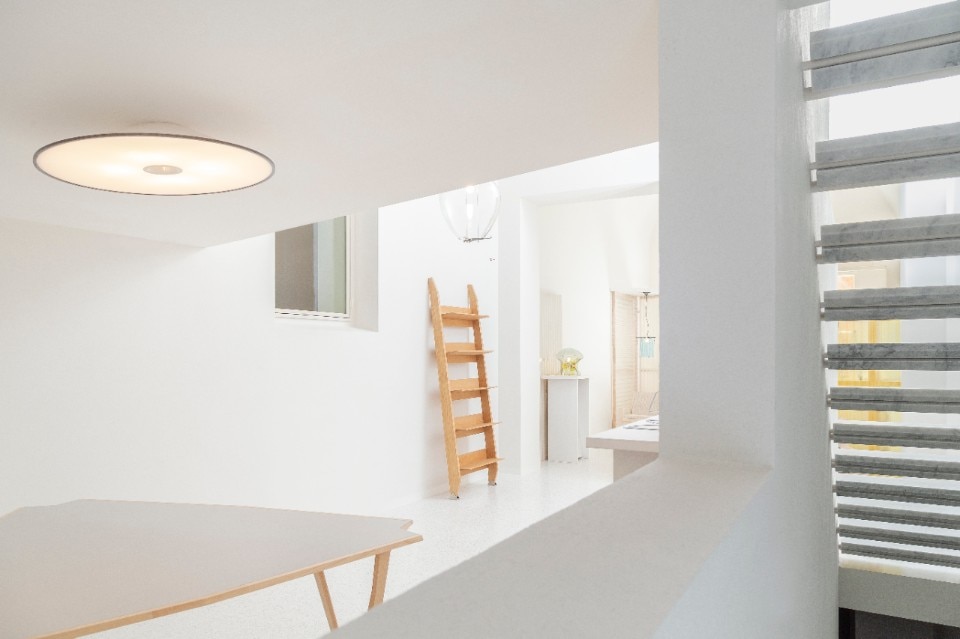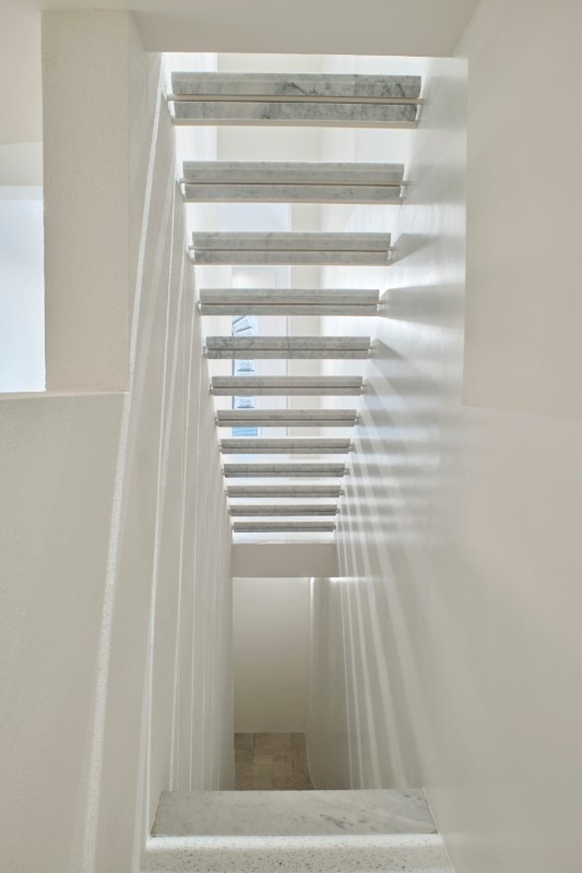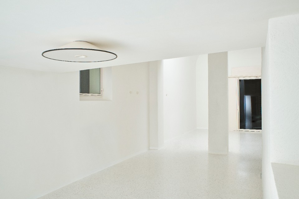 Accostando il pavimento in seminato di Carrara a smalti e intonaci di calce dall’alchimia variabile, Riva ha infatti chiesto alla luce di moltiplicare le gradazioni del bianco, in uno spazio che è semplice, ma – grazie a fenditure, diagonali e lievi scarti di sezione – mai banale.