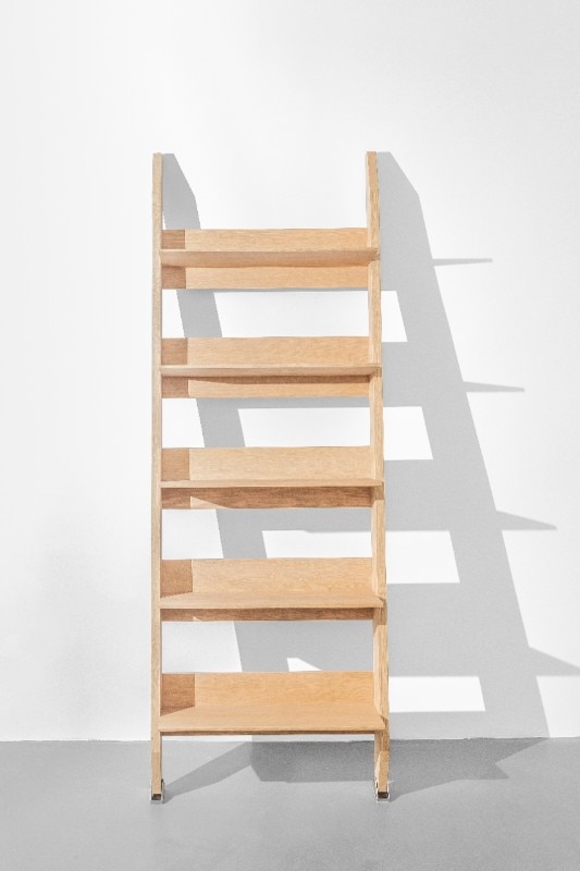 Sempre tre, numero dispari, dinamico e ‘borrominiano’ (siamo a pochi passi dal San Carlino), ripetuto in molte delle sue lampade, dagli esordi alla Sud-Est, che Riva immaginò come un omaggio a Paul Klee. Anche la libreria Pisa ostenta la sfiducia nella quiete classica, giacendo sghemba su due cerniere a terra per appoggiarsi al muro. Una console di frassino, sagomata come un coltello, trasfigura la mensola in una lama aerodinamica capace di orientare lo spazio: il design è architettura, e viceversa.