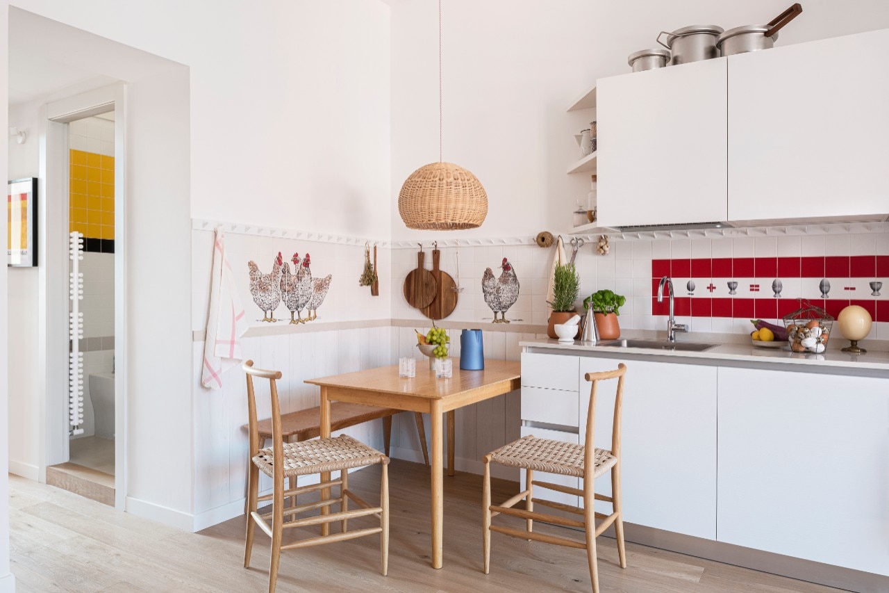 A pochi metri da questa “riunione di famiglia”, nel bagno, prende forma uno scenario più astratto. La cliente ama l’arte e la conosce. Con un gesto di sintesi un po’ surreale e un po’ provocatorio, il bagno diventa così la location per allestire una mostra personale dell’artista statunitense Ellsworth Kelly. “Volevamo che i colori delle piume, i suoni delle stoviglie e il profumo del bucato potessero trasformarsi in esperienza percettiva, ci serviva decostruire il visibile”. Con comuni piastrelle colorate, Paradisiartificiali riproduce alcune opere del maestro americano.