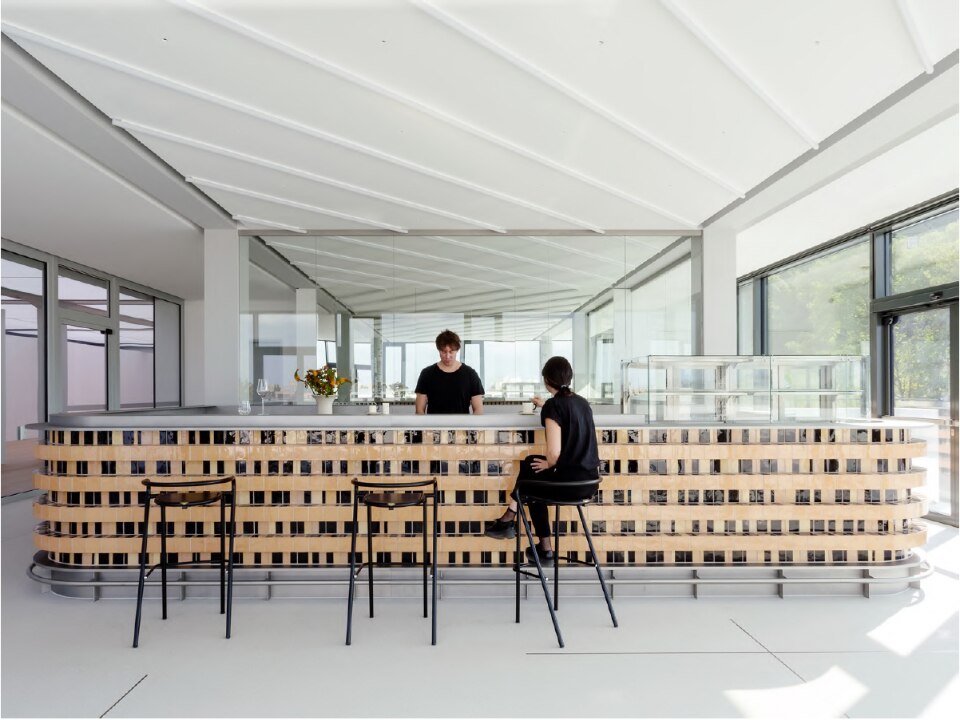I circa 350 m2 comprendono due banconi su due piani sovrapposti – uno nel foyer, con funzione di accoglienza, l’altro è una caffetteria – collegati visivamente dall’ambiente della scala. Spiegano i progettisti, che i due banconi sono stati concepiti come edifici “in scala 1:24, quella tipica del modellismo”.