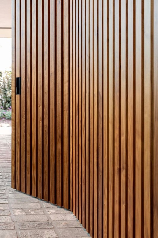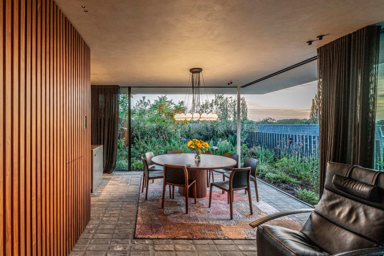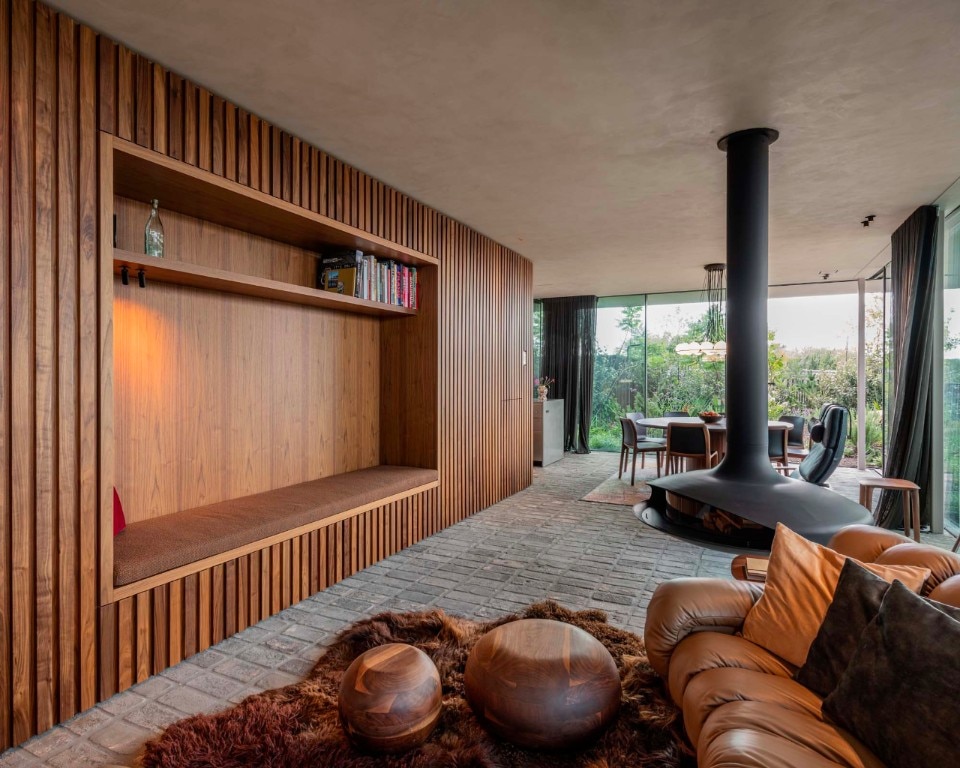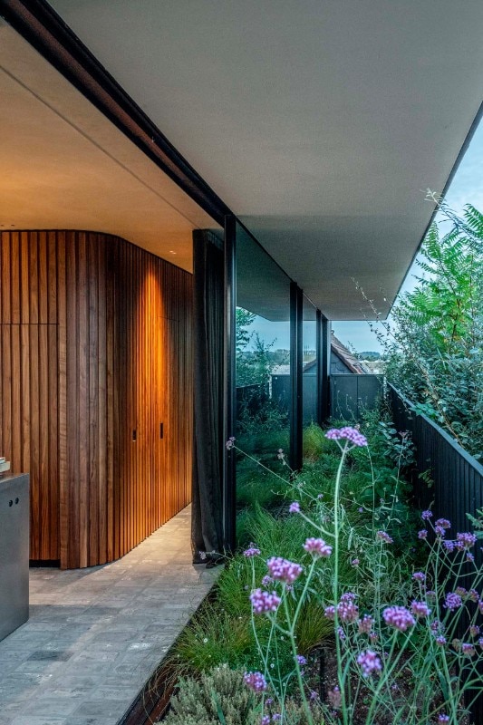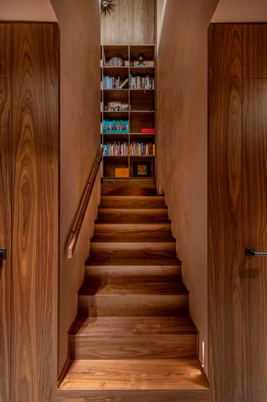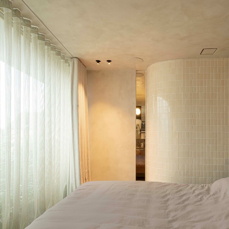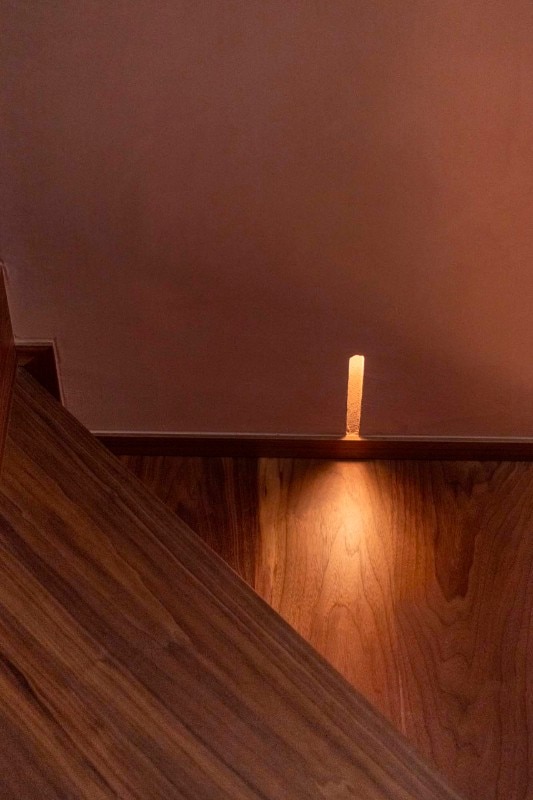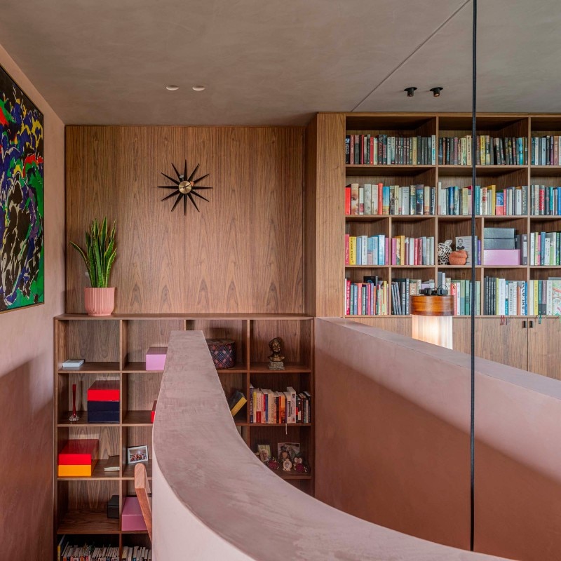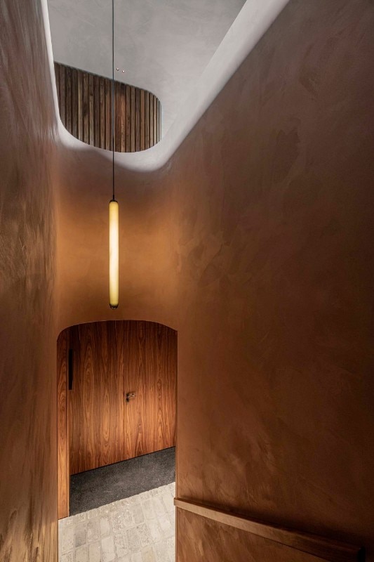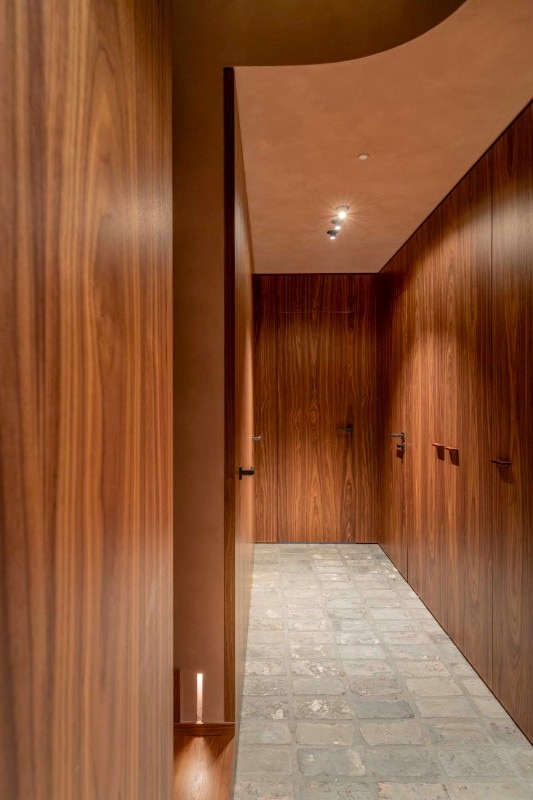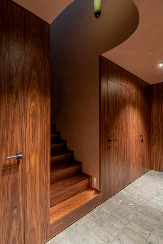 Al livello superiore, dove si situa l’ingresso, il giardino diventa parte dell'abitazione senza soluzione di continuità, grazie alle finestre a tutta altezza che sfumano i confini tra esterno e interno. Punto focale nello spazio, poi, è un volume centrale stondato rivestito in legno di noce che racchiude i servizi e che funge da snodo tra gli ambienti: la cucina e la zona pranzo nella testata con affaccio sul giardino; il soggiorno, lo studio e il salotto TV nella testata posteriore. Tra studio e salotto, la scala rivestita in noce conduce al livello sottostante dove si colloca la zona privata con camera da letto, servizi e un ambiente multifunzione con hammam.