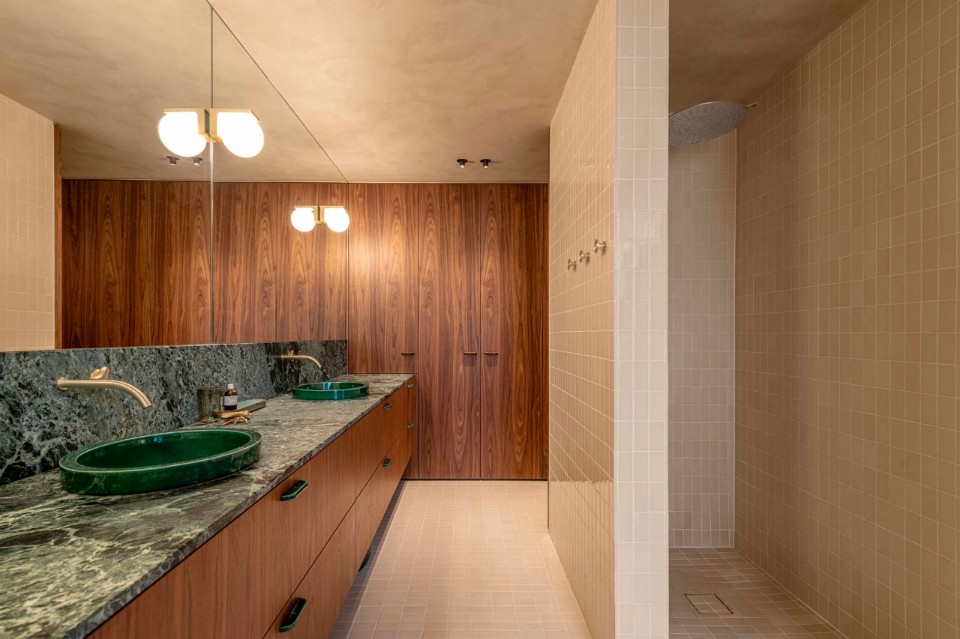 Se il livello superiore è fluido e luminoso, il livello sottostante è connotato da un’atmosfera intima e raccolta, grazie ai toni neutri e caldi degli intonaci e degli arredi, all’illuminazione soffusa e alle superfici avvolgenti in pietra grezza dei pavimenti e in legno di noce dei rivestimenti. Nel servizio en suite, note cromatiche in verde punteggiano maniglie, lavabi e piano in marmo, in delicato contrasto con le superfici neutre in ceramica e con gli armadi su misura in noce.
