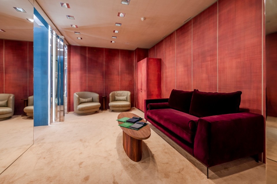 “Il lavoro con due specialisti come Tiziano Guardini, architetto-stilista, e il suo socio Luigi Ciuffreda”, prosegue Canella, “è stato fondamentale per il disegno di questi e di altri elementi ad hoc, così specifici alla funzione precisa di questo spazio”. Sono nuovi anche i due ampi camerini al piano interrato, stanze esclusive pensate per la realizzazione degli abiti su misura. Attraversando le loro porte d’acciaio cromato si accede a un universo altro, ammorbidito dal suolo in moquette, riscaldato dalle tonalità sature delle pareti ed equipaggiato di un minibar. La loro facciata vetrata è trasparente, ma opacizzabile all’occorrenza, per garantire la massima privacy dei loro ospiti.