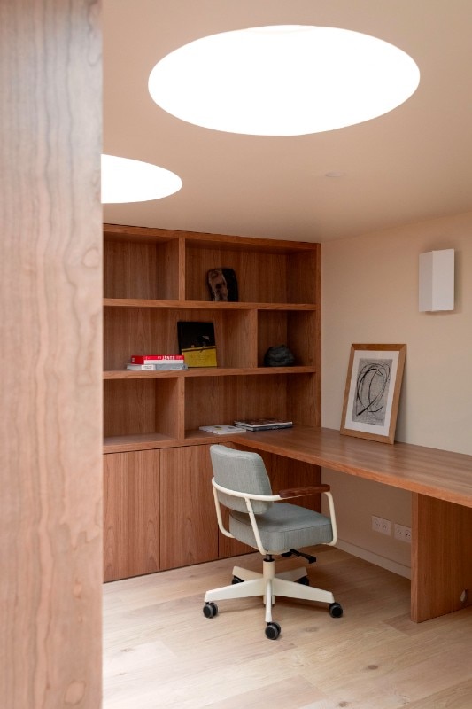 Gli spazi interni irradiati di luce (che filtra dalle finestre sul patio e dalla copertura vetrata) sono connotati da un’atmosfera raffinata ma calda e accogliente, dove materiali dominanti per gli arredi e le finiture sono il legno e la pietra, che ripropongono le matericità del giardino e i toni terrosi dei paesaggi costieri: immagine a volte salvifica nel grigiore di una capitale del nord.