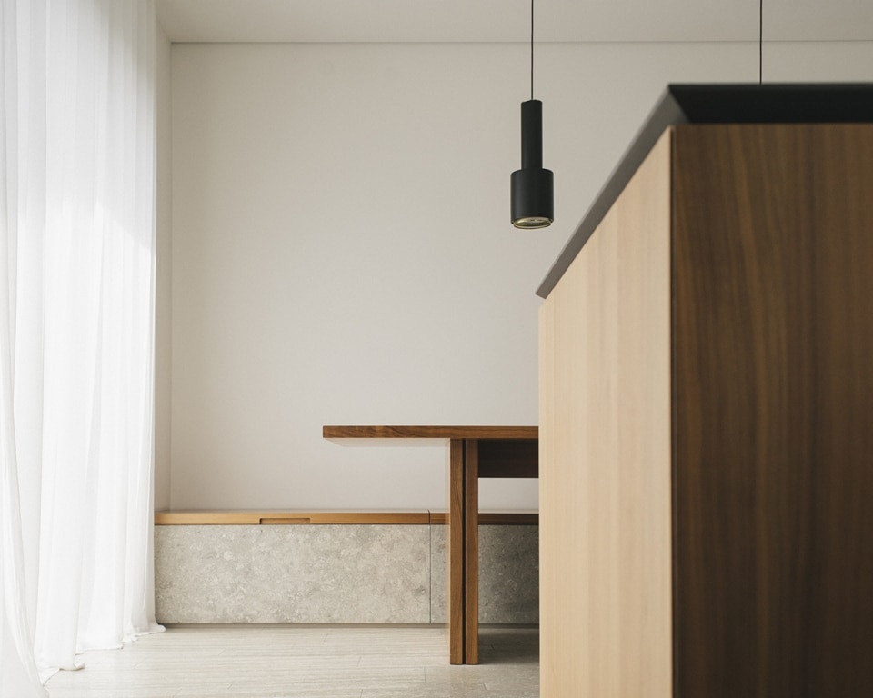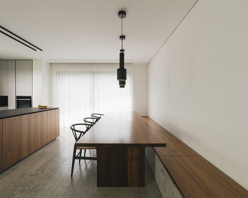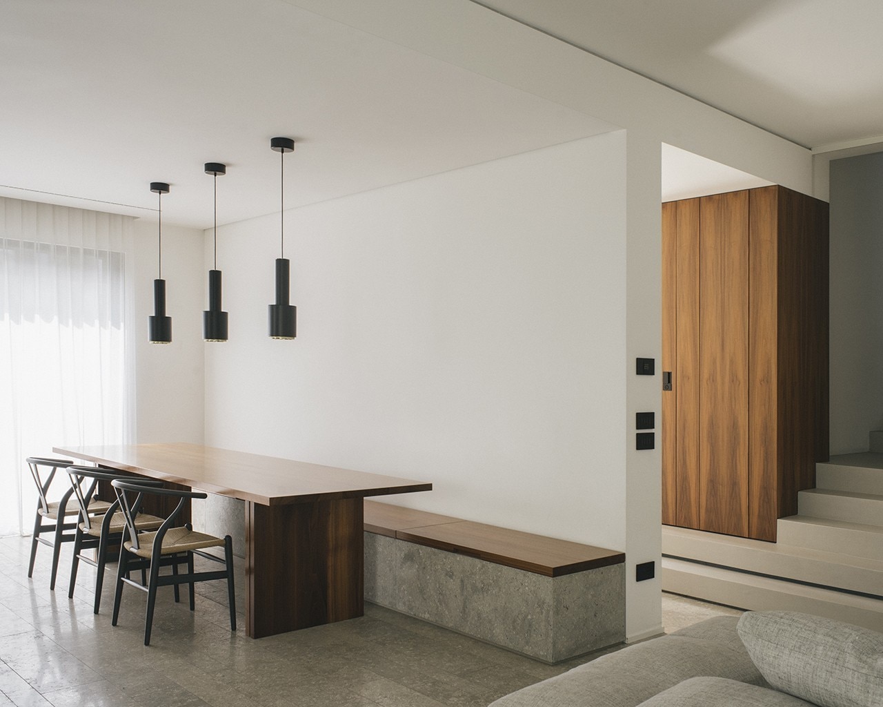 All’interno l’ambiente principale è quello della sala da pranzo con cucina a vista e isola, e che senza soluzione di continuità confluisce nell’area living, dove il grande divano con doppia chaise longue è in assoluto il vero protagonista. Anche in questo caso, le morbide linee di quest’ultimo contrastano con la netta ortogonalità del tavolo da pranzo in legno e della panca che si estende per l’intera lunghezza del muro retrostante. L’eco del modernismo veneziano di Carlo Scarpa si rintraccia nel trattamento della stretta scala che conduce al livello lievemente rialzato della zona notte prima, poi ancora al primo piano, dove uno studiolo occupa praticamente l’intera superficie calpestabile della mansarda.