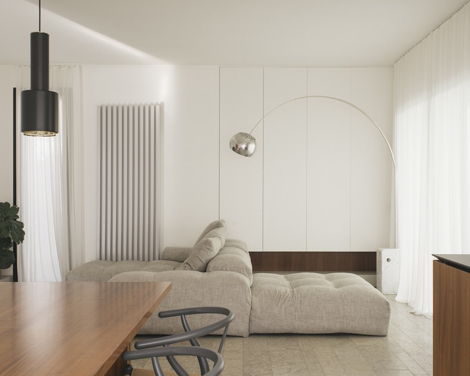 Già all’esterno l’incontro di materiali apparentemente contrastanti – quali la graniglia finissima scelta per i gradini del basamento di accesso all’appartamento, l’intonaco bianco alle pareti e i pannelli scuri che incorniciano le aperture della porta di ingresso e della portafinestra della sala da pranzo – suggerisce una certa discrezione nelle scelte d’intervento; allo stesso modo il tetto originario in tegole di coccio è preservato, e dialoga col preesistente muretto di cinta in mattoni, senza dunque snaturare quegli aspetti tipici del sobborgo di campagna, spesso presente in tutto l’intorno di progetto.
