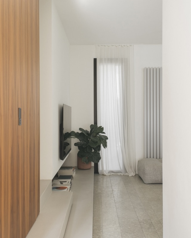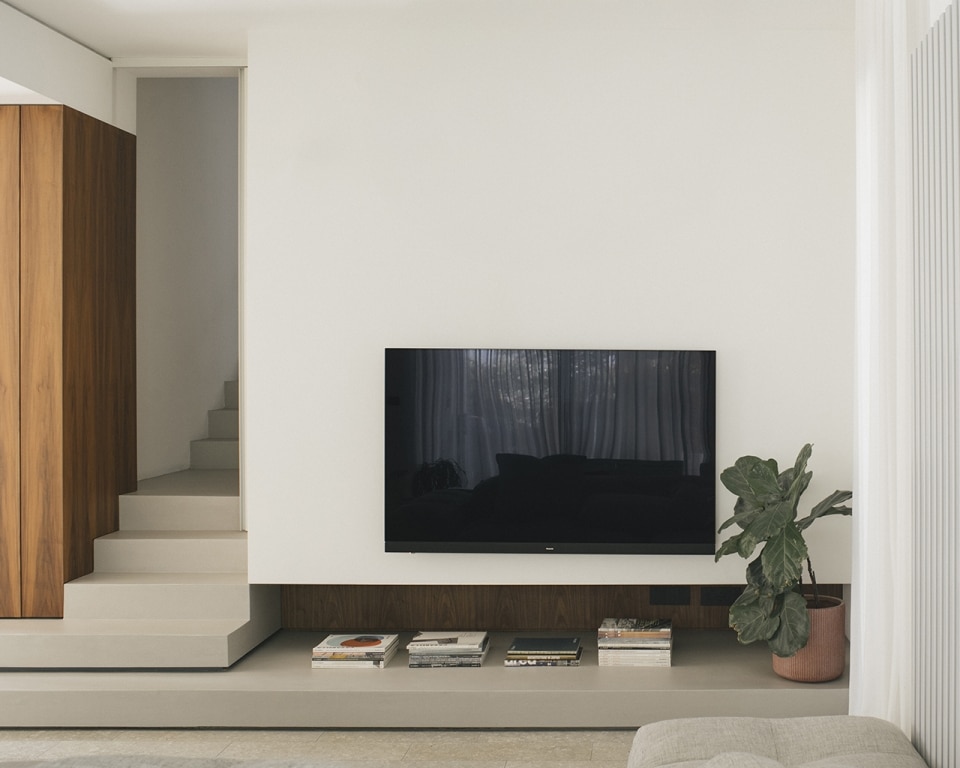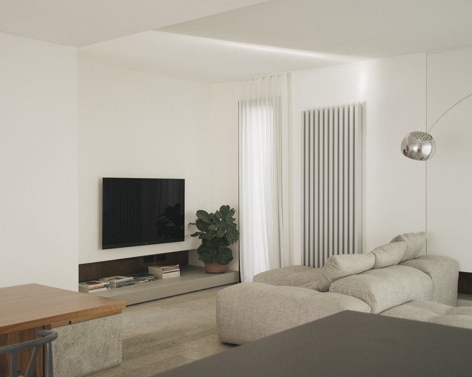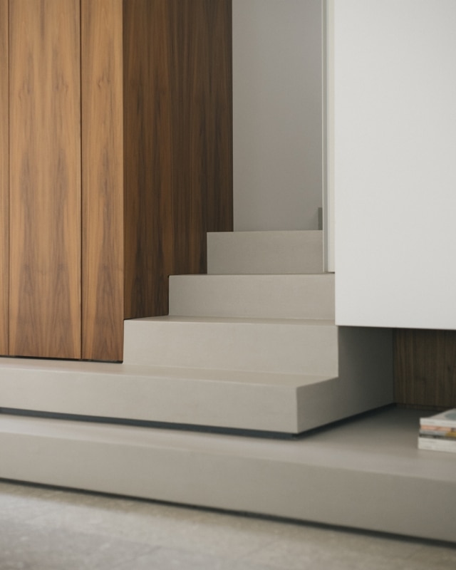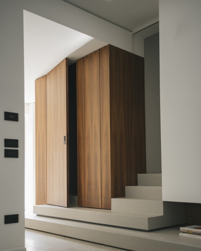 I gradini, quasi sospesi, generano una fenditura dello spazio, una vera e propria soglia fra aree diurne e notturne, enfatizzata dall’allungamento dei primi due gradini, che accompagnano alla porta di un piccolo bagno di pertinenza di soggiorno e sala da pranzo, accuratamente celato dietro due ante lignee, all'apparenza un guardaroba. Dal lato opposto, la stessa estensione del gradino produce uno scavo sotto lo schermo tv, destinato ad accogliere libri e riviste, e nascondere elegantemente le prese elettriche.
