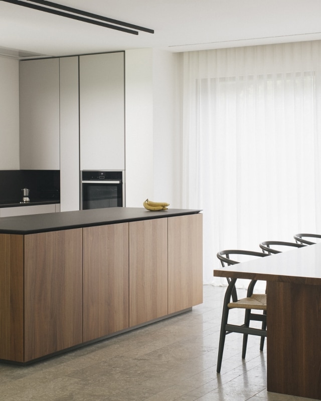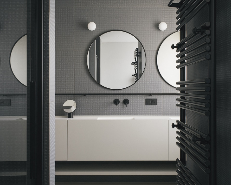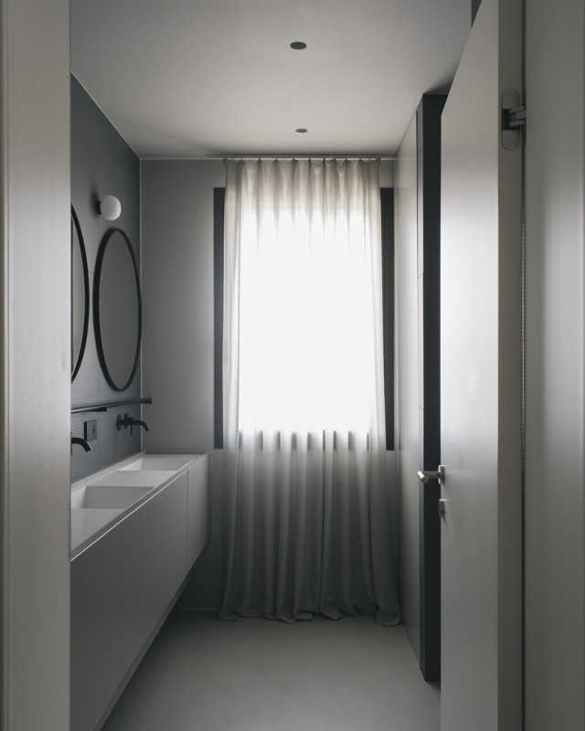 Se gli spazi principali sono connotati principalmente dai colori chiari delle pavimentazioni, dal legno dell’arredo fisso e dal bianco delle pareti, nei bagni le cromie in scala di grigi donano un effetto di assoluto riposo agli spazi più intimi, restituendo un generale senso di equilibrio all’intero progetto domestico.