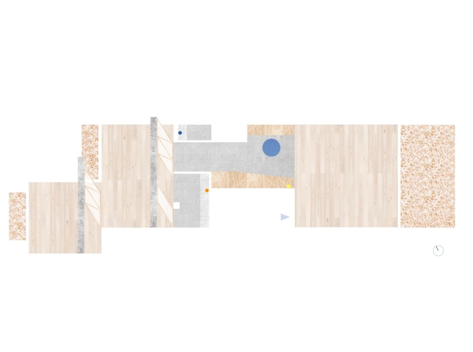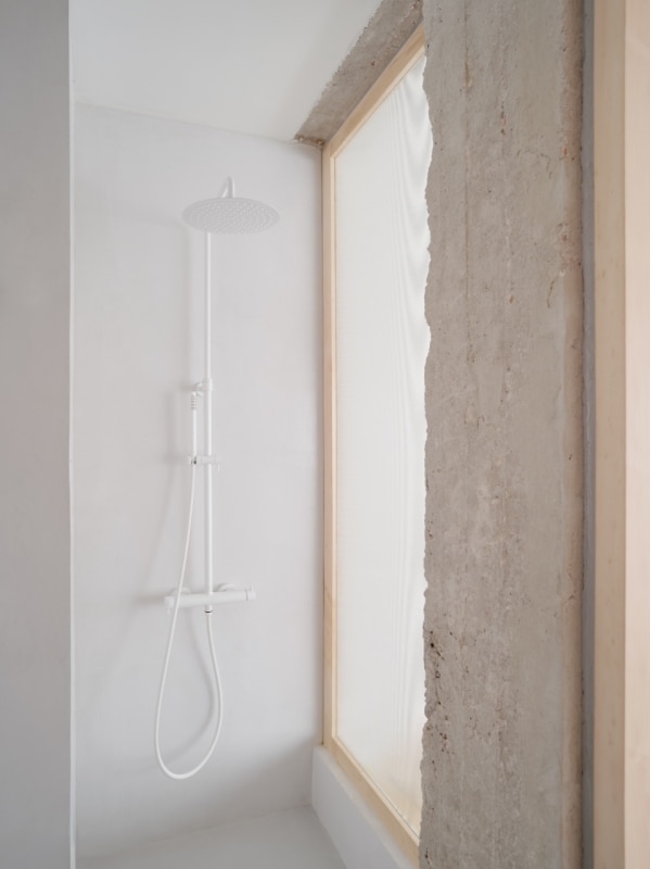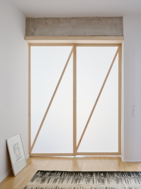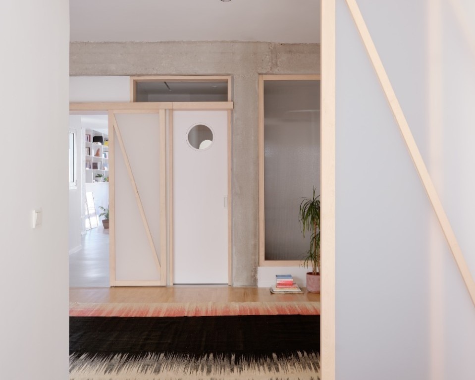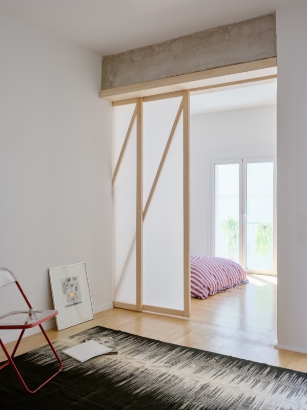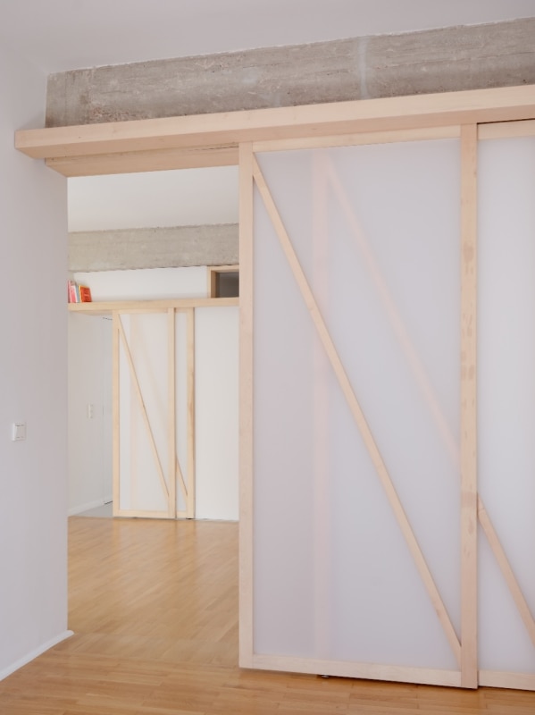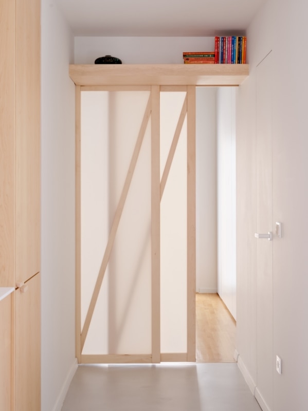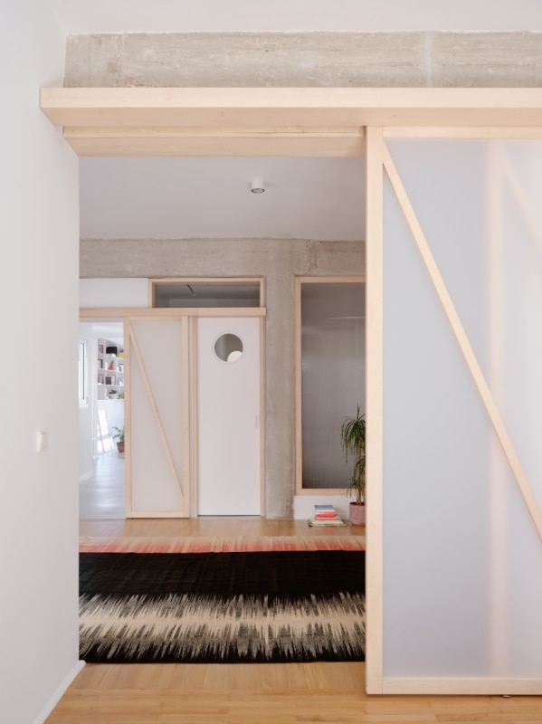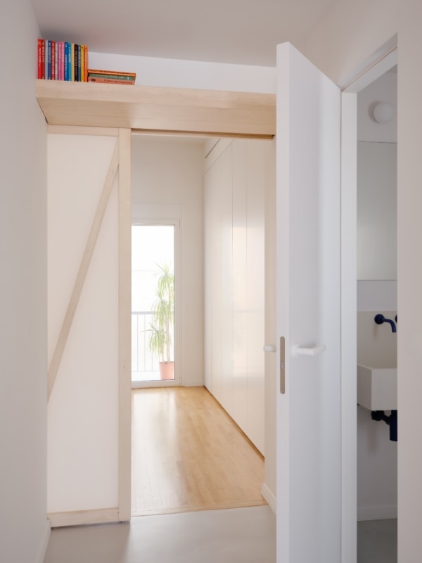 L’interno si articola su un asse che unisce idealmente e concretamente alba e tramonto, le zone private della casa con quelle di vita familiare e conviviale; ed è un asse costruito sul flusso, di luce come di azioni e di movimenti. Via le partizioni fisse esistenti, viene lasciato a vista il cemento grezzo delle strutture. E il nuovo concept di partizione mobile e traslucida, il nodo del progetto nato dall’ispirazione shoji, integra le scaffalature, inquadra le prospettive degli interni e si fa vettore del flusso della luce anche in spazi altrimenti ciechi, come i bagni.