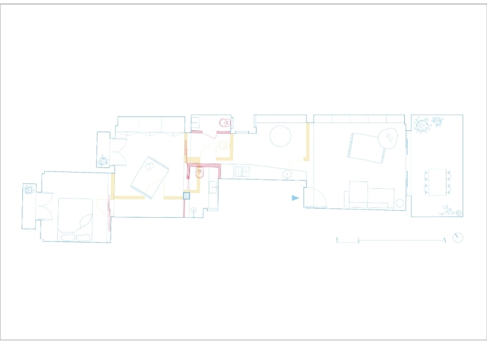 Il living aperto sul terrazzo si concatena così con la cucina, resa un ibrido tra spazio conviviale e di passaggio, con l’inserimento di una panca bassa per il tavolo lungo il muro. Prosegue poi con la fascia dei servizi per addentrarsi nell’area privata, con la stanza multiuso e il bagno padronale, fino allo spazio intimo della camera da letto.