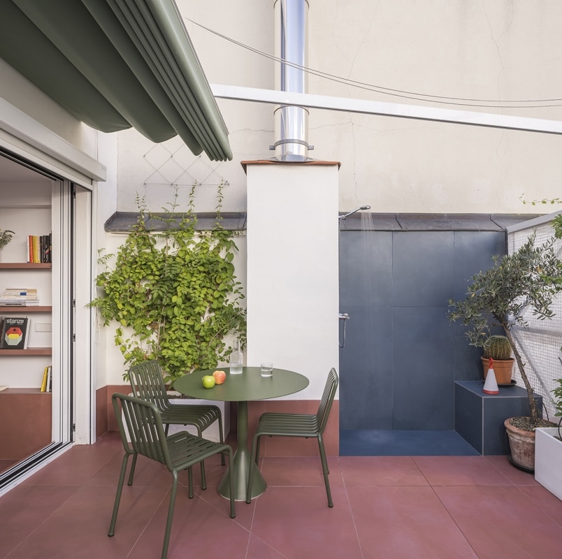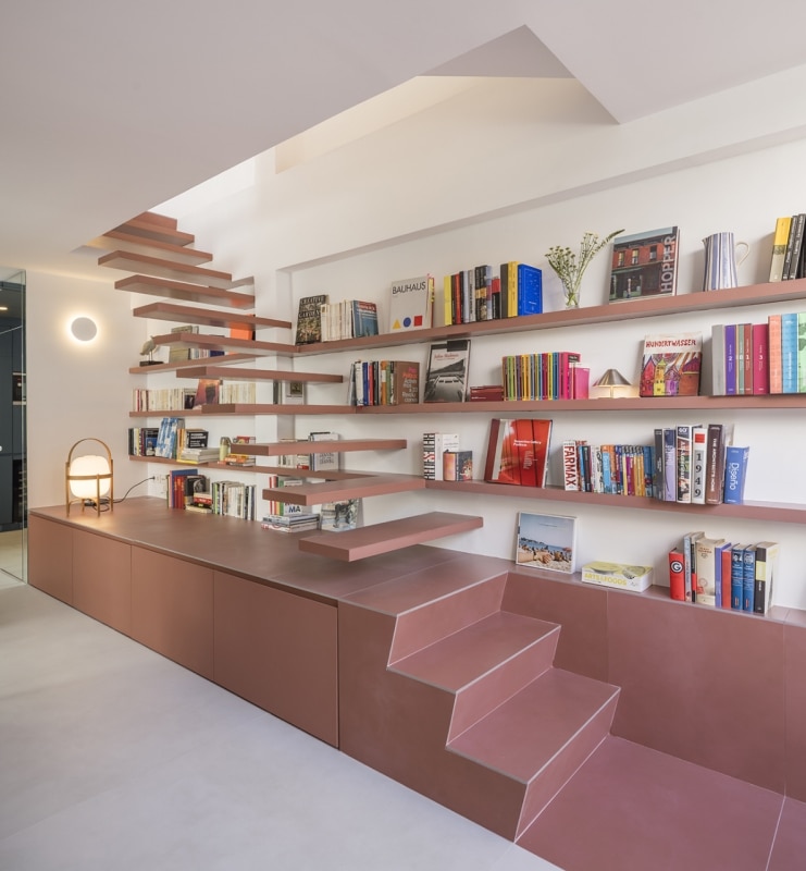 Se i primi gradini restano monolitici, ancorati a un mobile contenitore che si estende in lunghezza per l’intero spazio della parete, la scala procede sverso il livello superiore smaterializzandosi, la struttura si sospende, i gradini si tramutano in mensole, e il color terracotta, già presente nella pavimentazione della terrazza, risale fino a sbarcare al primo piano, in una sorta di luogo di transito, flessibile nel suo utilizzo mentre fa da accesso a camera da letto e bagno.