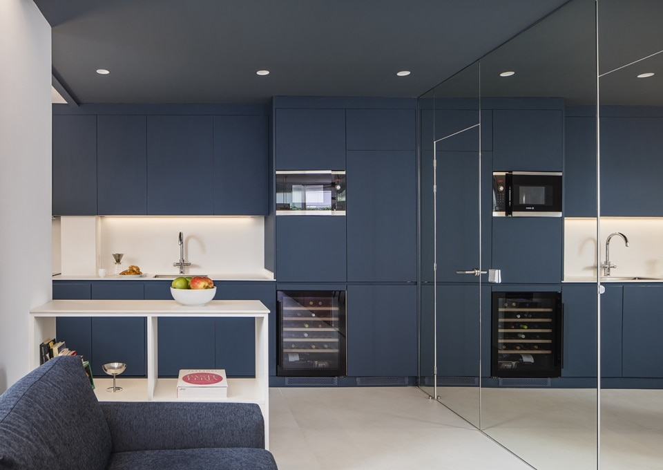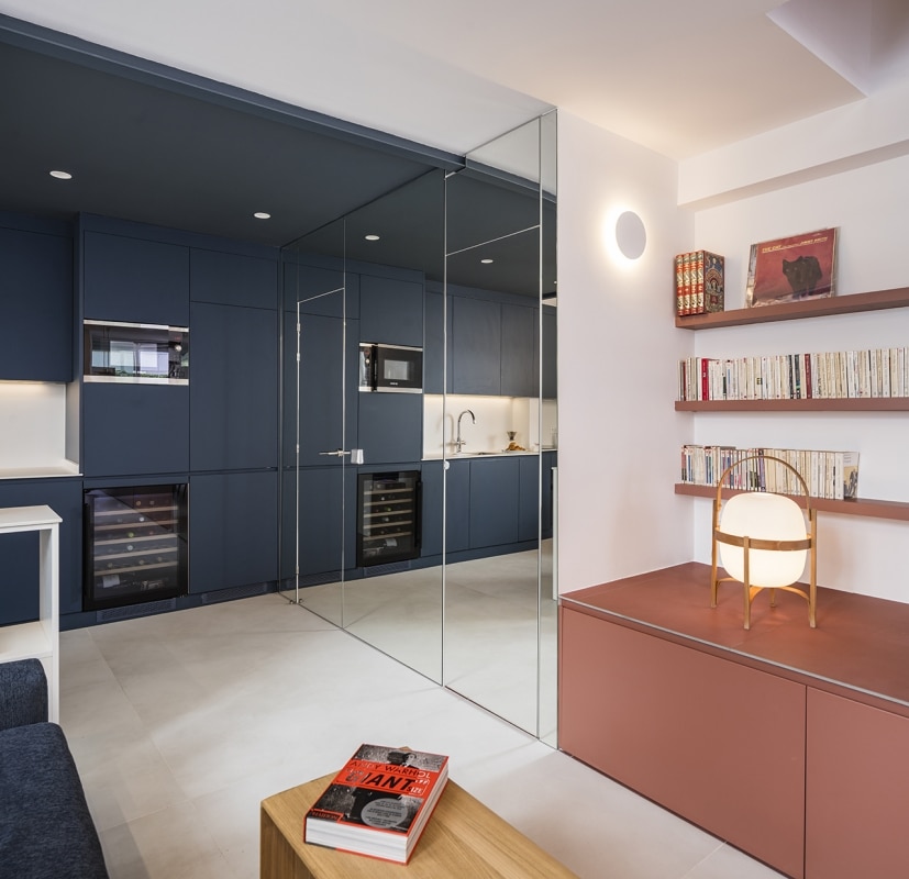 La presenza, a ciascun livello, di specchi a tutta altezza è un ulteriore elemento caratterizzante, dilata gli ambienti e confonde il punto di intersezione fra spazi intimi e sociali; le tinte decise dell’arredo e la scelta di pezzi di lighting dal design riconoscibile, come le due lampade a sospensione PH 5 di Louis Poulsen sul tavolo da pranzo o le Dipping Light di Marset al piano superiore, rivitalizzano ulteriormente l’appartamento definendone la nuova veste contemporanea.