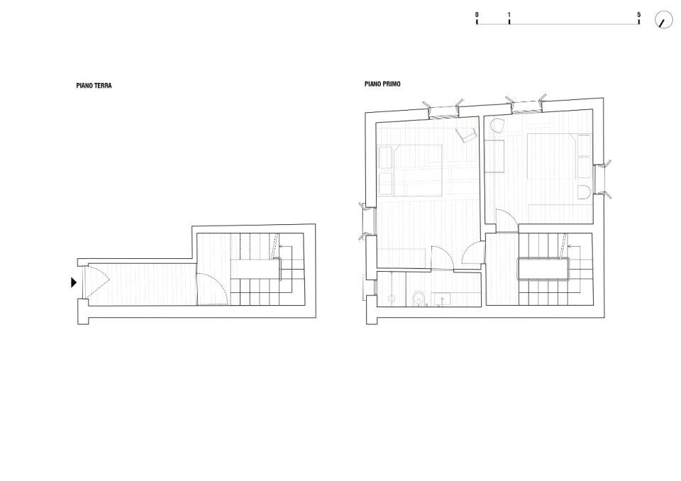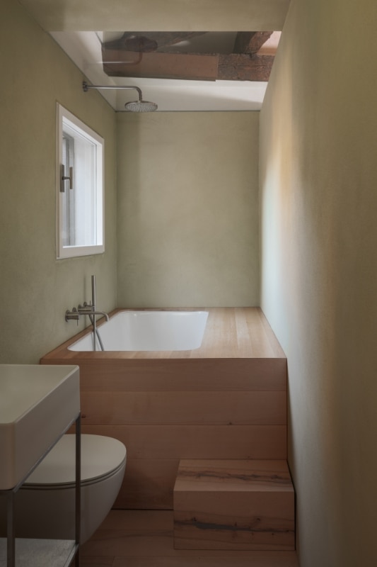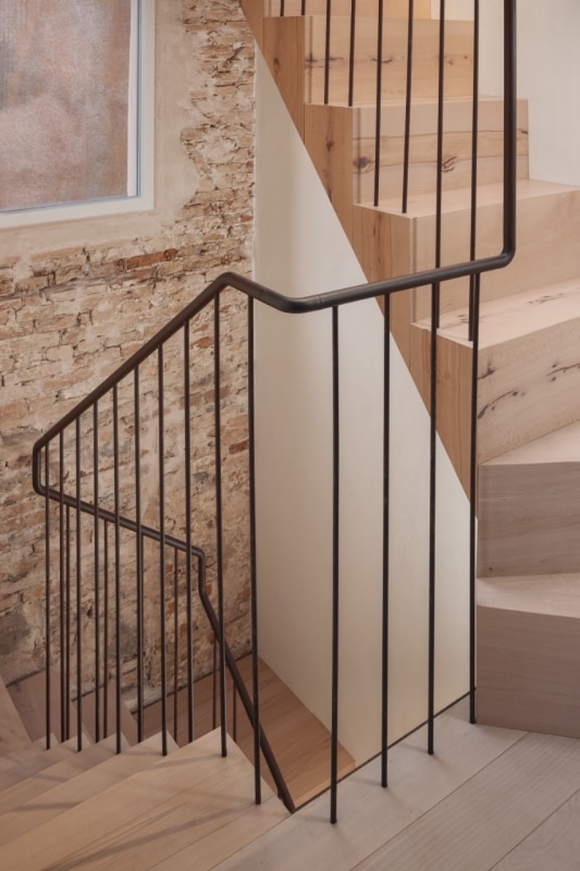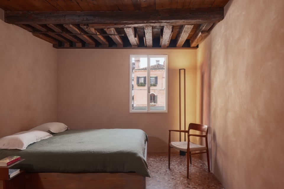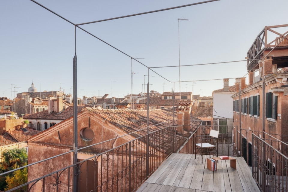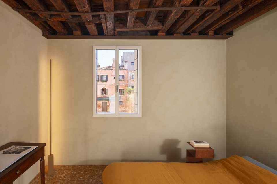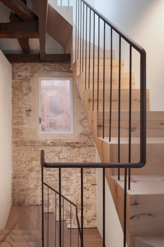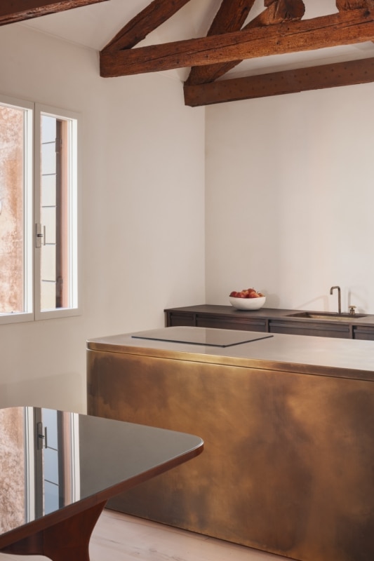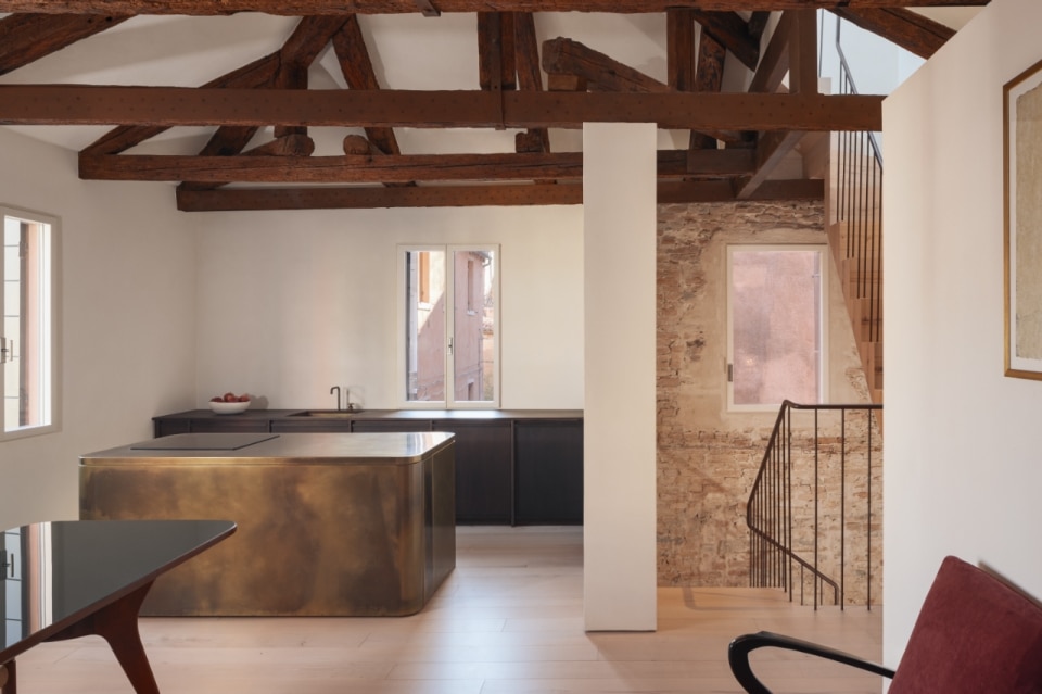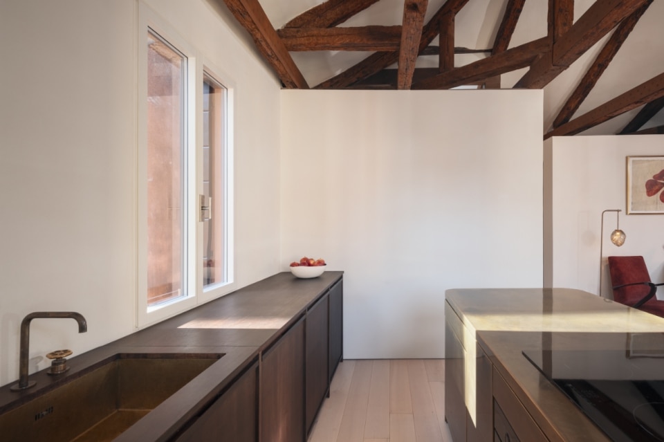 Questa piccola casa nel sestiere di Cannaregio, a Venezia, racconta la propria storia e quella del suo intorno, moltiplicando e reinterpretando i segni della città lagunare. Si tratta di una casa terracielo, una tipologia abitativa indipendente e sviluppata su più piani, tipica dei centri storici italiani. Il progetto di Elena Martucci ha rimosso le tracce delle precedenti ristrutturazioni per ricomporre i frammenti di un racconto unitario. Venezia si legge nei materiali: nel faggio rosato che riveste la scala, proveniente dall’Altopiano del Cansiglio; nella pietra d’Istria posata nel pavimento del bagno, la stessa impiegata per ponti, edifici e monumenti durante il periodo della Serenissima. La luce veneziana si ritrova sull’ottone brunito dell’isola in cucina, mentre la superficie di vetro colorato del tavolo da pranzo richiama l’acqua dei canali. Con il nuovo intervento, l’eliminazione dei controsoffitti rivela l’intreccio delle travi in legno, e l’assenza di intonaco su alcune pareti restituisce la trama originaria dei mattoni, riportando alla luce la materia autentica dell’edificio.