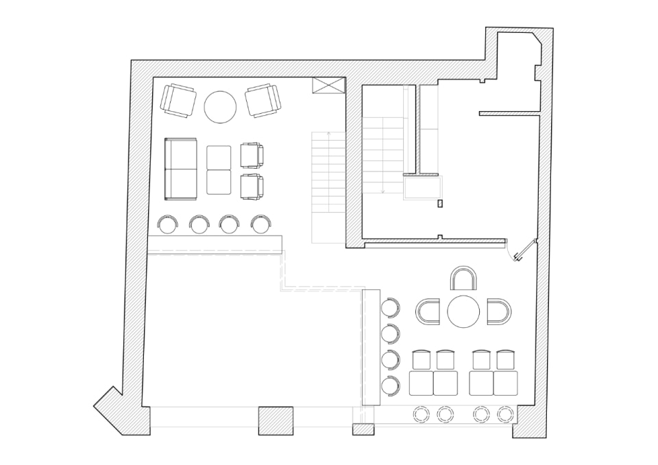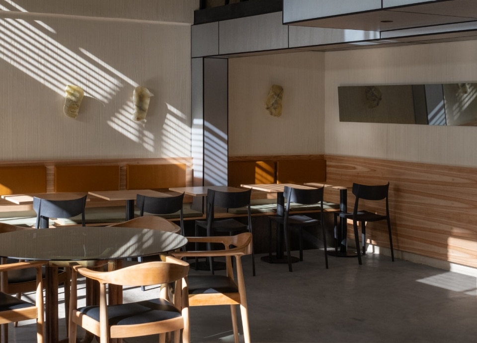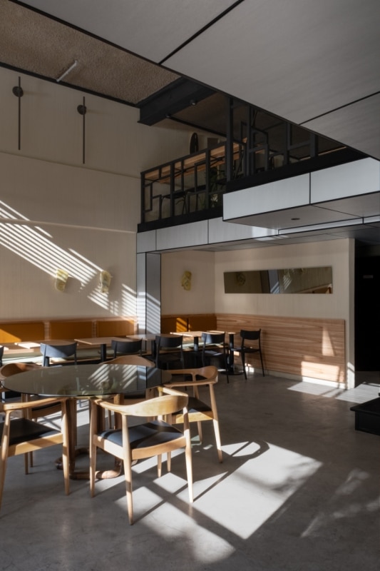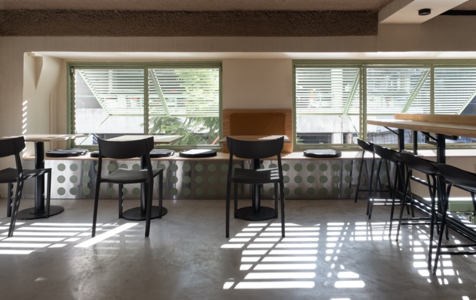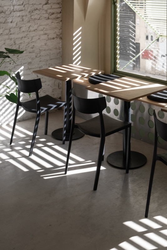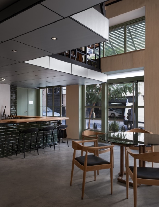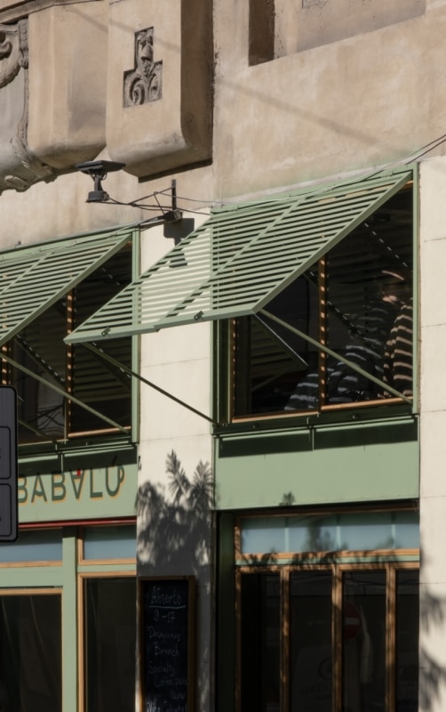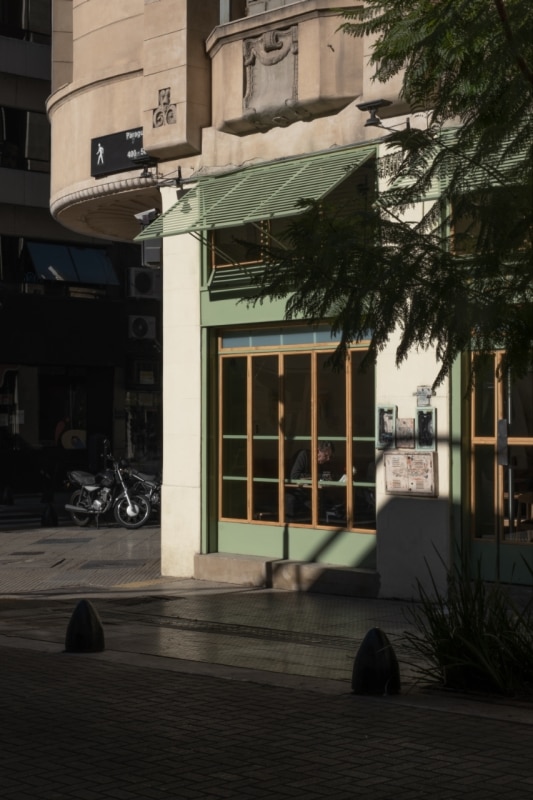Al piano terra dell’Edificio Kairuz, uno degli esempi più significativi di architettura Liberty di Buenos Aires e recentemente ristrutturato, lo studio di architettura Miyao ha curato il progetto di Café Babalú. L’intervento si sviluppa su due livelli: quello affacciato sulla strada, dove le grandi vetrine garantiscono un rapporto diretto con lo spazio urbano e un piano superiore più raccolto, dove la luce filtra attraverso persiane metalliche che funzionano come brise-soleil. Verniciati in un caratteristico verde salvia, gli infissi costituiscono l’elemento di continuità tra il linguaggio dell’edificio storico e il nuovo intervento. Il colore ricorre in tutti gli elementi metallici e dialoga con l’architettura dell’Edificio Kairuz, costruito nel 1913 e riconoscibile per i balconi curvi che ricordano palchi teatrali e per la cupola metallica che ne conclude la composizione. Proprio per valorizzare le qualità dell’involucro esistente, il progetto del café è impostato secondo una logica di sottrazione. All’interno lo spazio si articola attraverso pochi elementi, definiti soprattutto dalla ricerca sui materiali: superfici in onice dialogano con il ferro verniciato e contrastano con il calore del legno chiaro utilizzato per boiserie e arredi.