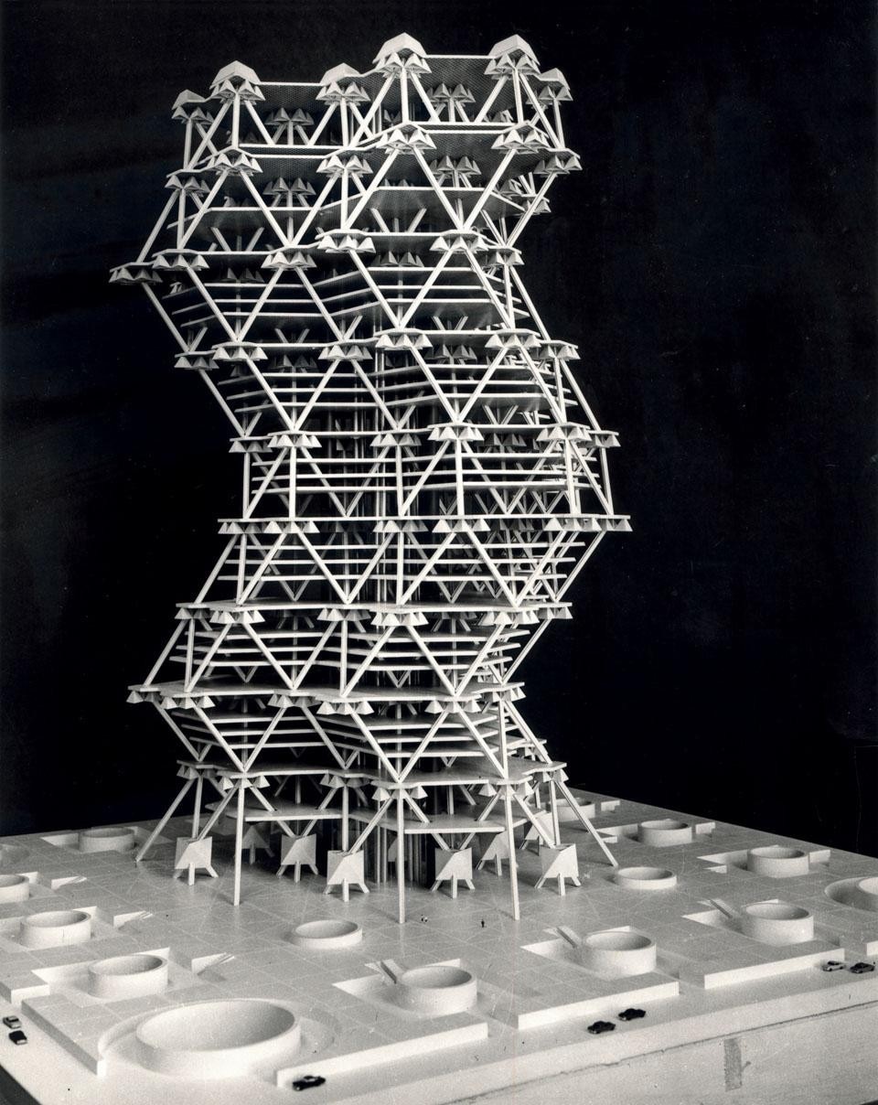 Certo. Ma si trattava di un progetto a cui lavoravo nei ritagli di tempo, non chiesi alcun compenso. Lo facevo in studio, quando mi restava del tempo. Era solo un progetto che stavo seguendo per conto mio, proprio come quello per la scuola elementare. Anche la Torre stava diventando così, ogni livello era fatto in modo da collegarsi a quello successivo andando a formare una struttura continua. Non si trattava solo di un pezzo e di aggiungercene un altro sopra: i supporti verticali sono parte di quelli orizzontali così la struttura è quasi cava. Ma poi, naturalmente, bisogna ricavarne più spazio abitabile possibile. I supporti triangolari erano molto distanti gli uni dagli altri e tutto era triangolare, o meglio tetraedrico. Era tutto tridimensionale. In pianta hai un uso efficiente dello spazio, in termini di funzionalità della struttura. E poi c'è l'idea che l'edificio sembra girarsi per seguire il flusso strutturale della sua stessa geometria. Questo era l'aspetto interessante del progetto, li faceva sembrare quasi vivi. Era molto intrigante.