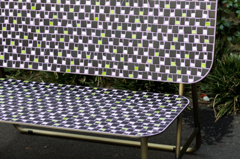 Oggi questa idea rivive nella serie pensata appositamente per Milano: “Una nuova interpretazione, dove la tecnica costruttiva viene affinata così come la ricerca nei materiali, ed i protagonisti del racconto diventano i luoghi più simbolici di Milano. Un omaggio a Milano e all’Arengario di Portaluppi, Muzio, Magistretti e Griffini”, spiegano gli autori. Dalla collaborazione con Besana e dal fascino della sua tecnica musiva deriva anche la collezione di mobili da esterni realizzata per Nilufar: qui più che il luogo è il tempo ad essere considerato nella sua accezione di tradizione, capace di creare un ponte di connessione tra passato e presente. Muzauwaq, infatti, rielabora in chiave contemporanea il tradizionale linguaggio del mosaico e la sua storia millenaria attraverso una lineare struttura in ottone brunito che serve da base per l’esaltazione di arredi che trovano nel contatto con aria, luce e verde la loro collocazione ideale. La tenuta in esterno è assicurata da una rivisitazione tecnica, grazie a una resina colorata che sostituisce la tradizionale malta come collante per le tessere in vetro e marmo. L’effetto così si rende ancora più unico e pronto ad essere esaltato dalla variazione di luce ed ombra dell’irraggiamento solare. Sempre caratterizzato dall’apertura verso l’esterno è il progetto di living proposto con Novamobili. Exquisite Jungle ricrea un mondo vegetale in un interno abitativo, dove il verde diviene il leit motiv di un’operazione di zonizzazione domestica. La zona di concentrazione, quella di relax o quella di condivisione sono così scandite dal “classico sistema contenitivo che diventa importante grazie all’uso di materiali differenti e ricercati, come il rame e il vetro, trasformandosi in un prezioso scrigno”.