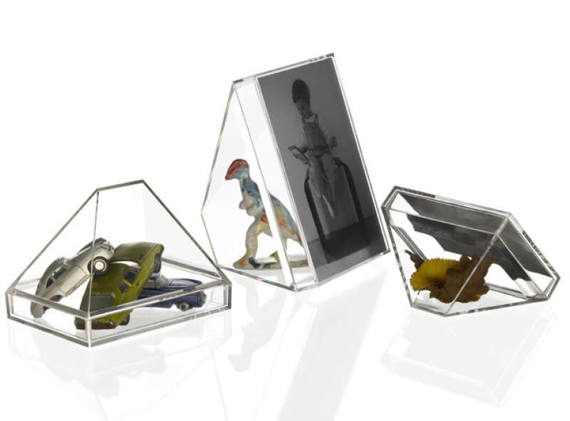 The form developed from the need to be able to stand the photograph in portrait or landscape format and at different angles. The result is a truly flexible multi directional container. Clear plastic material adds another layer of interest by giving the boxes a jewel like, glass cabinate character; protecting and exhibiting their contents at their best.