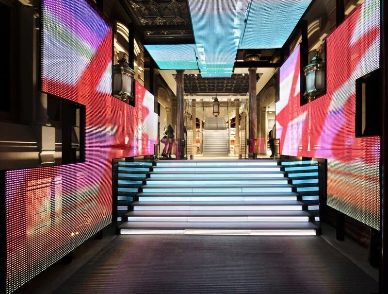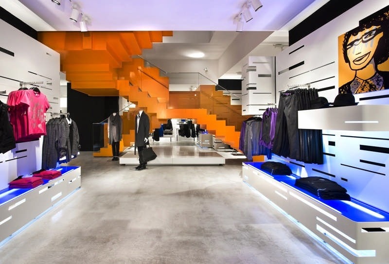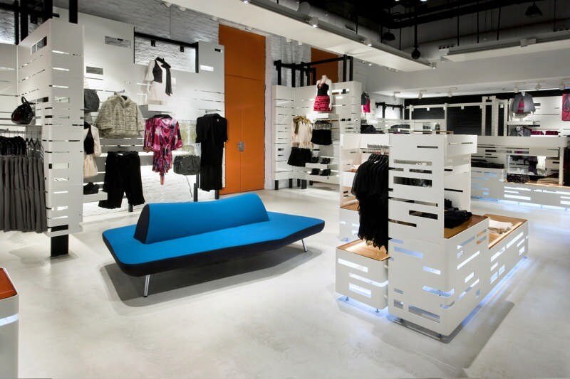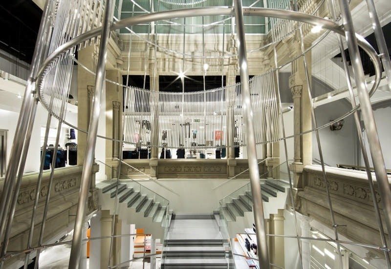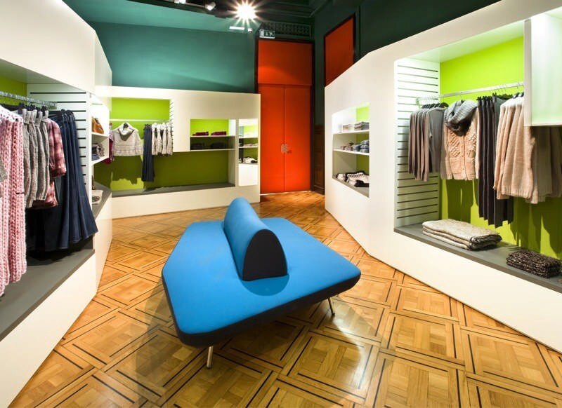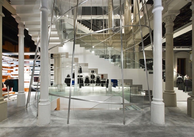 Infatti, sui tre piani e nei 1.720 metri quadrati di spazio oltre alle collezioni donna, uomo e bambino, c’è posto anche per alcune sorprendenti ‘invenzioni’ dello studio catalano. Come il grande arredo-scultura in metallo che contrasta con le finiture originali in pietra o la scenografica scala posta nella zona centrale che filtra la luce in arrivo dal lucernario superiore. Scaffali, contenitori e pareti divisorie sono volutamente neutri, in metallo bianco con aperture geometriche che servono per riporre, contenere e appendere i vestiti. All'insegna della flessibilità: ogni elemento è infatti rimovibile e può dare vita a molteplici combinazioni. Tutto il resto - dai divanetti, alle porte alle nicchie nelle pareti - è luce e colore.
