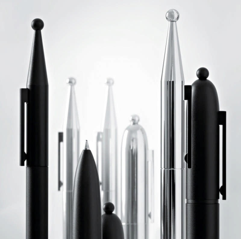 "I clearly remember one day, many years ago, when Aldo came to see me in my office in Crusinallo. At one point he took a small metal cylinder out of his jacket pocket. At first sight there was no way it could have been a household object - but it was actually a pen! A pen designed in the same way as his coffee pot “La conica” (1984) but, with the same harsh yet playful lines which distinguished such an important Alessi design, seemed to me to take on its own natural identity as a writing implement. At that time we weren’t able to engineer or produce this type of object, so I put Rossi’s prototype in my desk drawer, until now, when the project has finally been brought to life as part of our work with the Japanese firm Mitsubishi, our industrial partner in this field. The project, designed in collaboration with Claude Zuber, his assistant at that time, is presented in the two original forms of Rossi’s coffee pots: the cone and the dome."