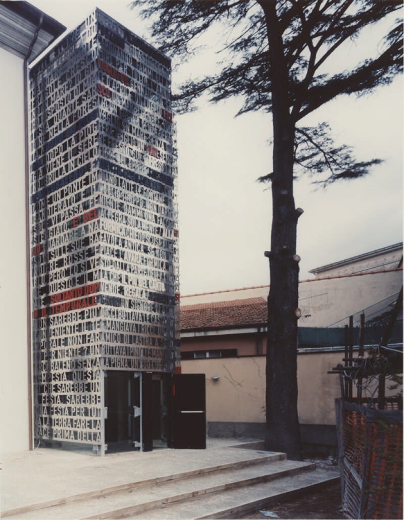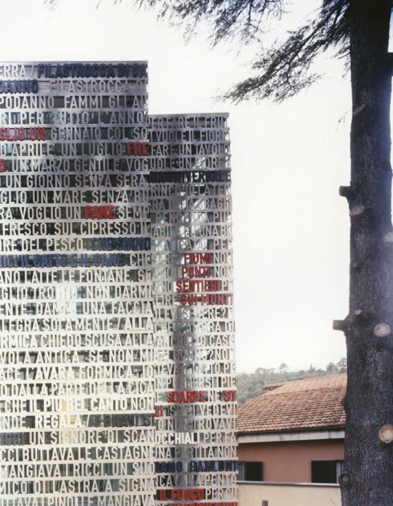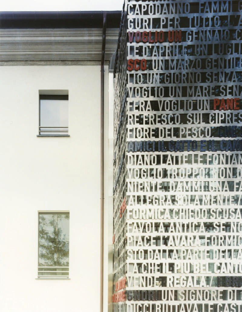The project, that has included the creation of a library, games area and auditorium, moves along two tracks, the exterior and interior, an introverted and seemingly neutral outward appearance combined with an extrovert interior made up of spatial sequences, perspectives, areas of colour and nocturnal metamorphoses. The whole thing sealed by the poetic dimension of the external circulation system “wrapped” in rhymes by Gianni Rodari, punctuated by the work of art by Danilo Trogu who once again, after the Palazzo del Ghiaccio in Milan, manages to project a magical and dreamlike dimension through the use of careful and delicate layering.