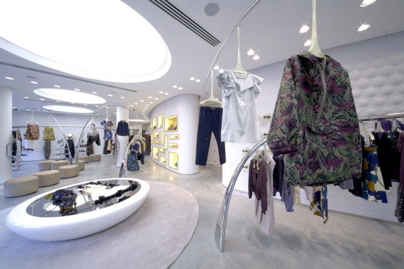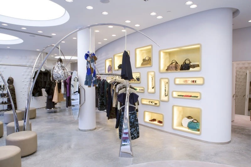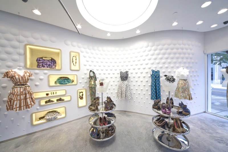 Consuelo Castiglioni e gli architetti dello studio Sybarite hanno giocato con forme circolari, ripetendole all'interno del negozio di 230 metri quadri. L'elemento che caratterizza la boutique è un muro bianco con delle semisfere in rilievo che richiamano i motivi architettonici Art Deco.